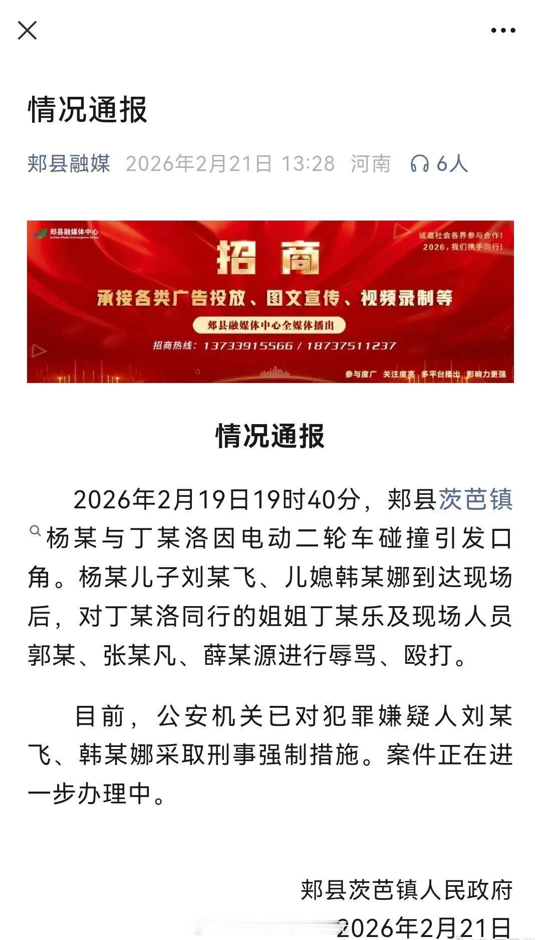 警方通报平顶山打人事件【河南平顶山针对网传“15岁女孩被当街暴打”发布情况通报】平顶山打人者被采取刑事强制措施 21日,河南省平顶山市郏县茨芭镇人民政府针对网传“15岁女孩被当街暴打”的情况发布通报。通报称,2月19日19时40分,郏县茨芭镇杨某与丁某洛因电动二轮车碰撞引发口角。杨某儿子刘某飞、儿媳韩某娜到达现场后,对丁某洛同行的姐姐丁某乐及现场人员郭某、张某凡、薛某源进行辱骂、殴打。