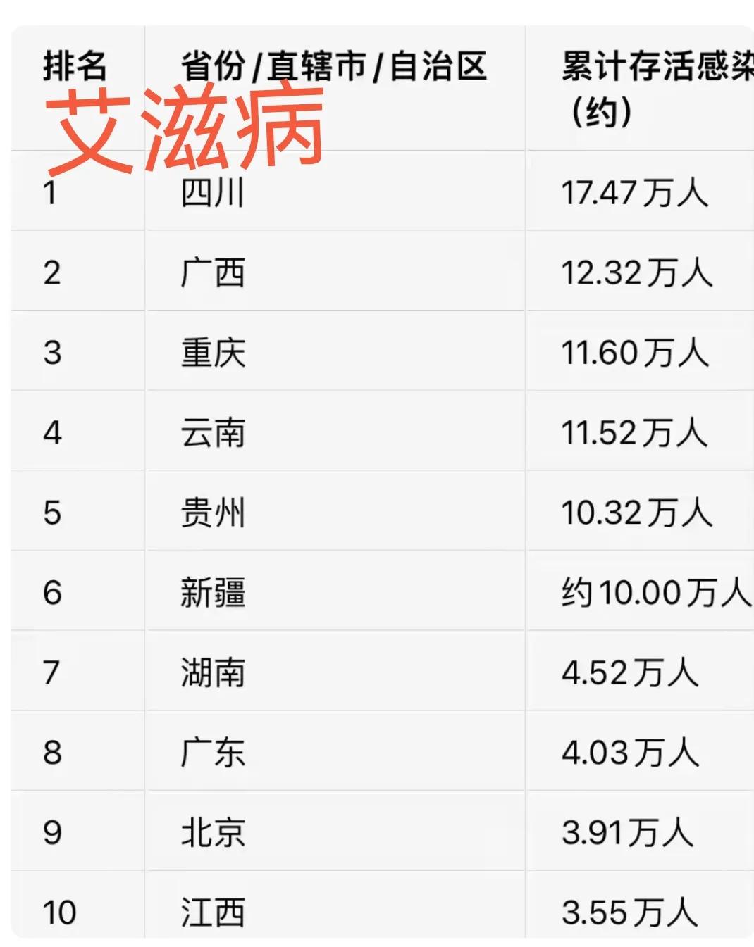 四川第一,广西第二。 2025年,美国艾滋病病人130万。 国内120万,大约平均100个人里,就有一个艾滋病人,还不包括没查出来的。 “一种慢性病而已,关系不大”,轻飘飘一句话,体现出,有人没把这种病当回事。 原来艾滋病离你真的很近!,有异性,约你,勾引你的时候,不要觉得是你有多大的魅力,有可能他有艾滋病,上到老年人,下到中学生大学生,都是高发群体。据说有些还有专门的群。每天报备传染了多少人。所以不管男女,信与不信,一定要管好自己的下半身。