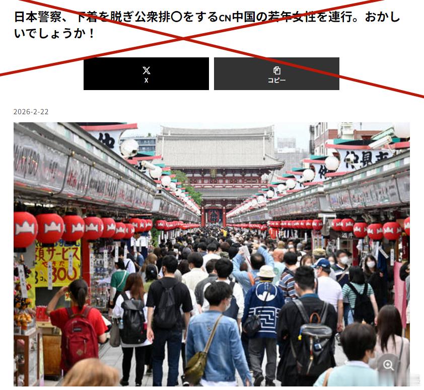 有日本自媒体今(22)日自称:“日本警方逮捕了一名脱掉内裤并在公共场合排便的中国