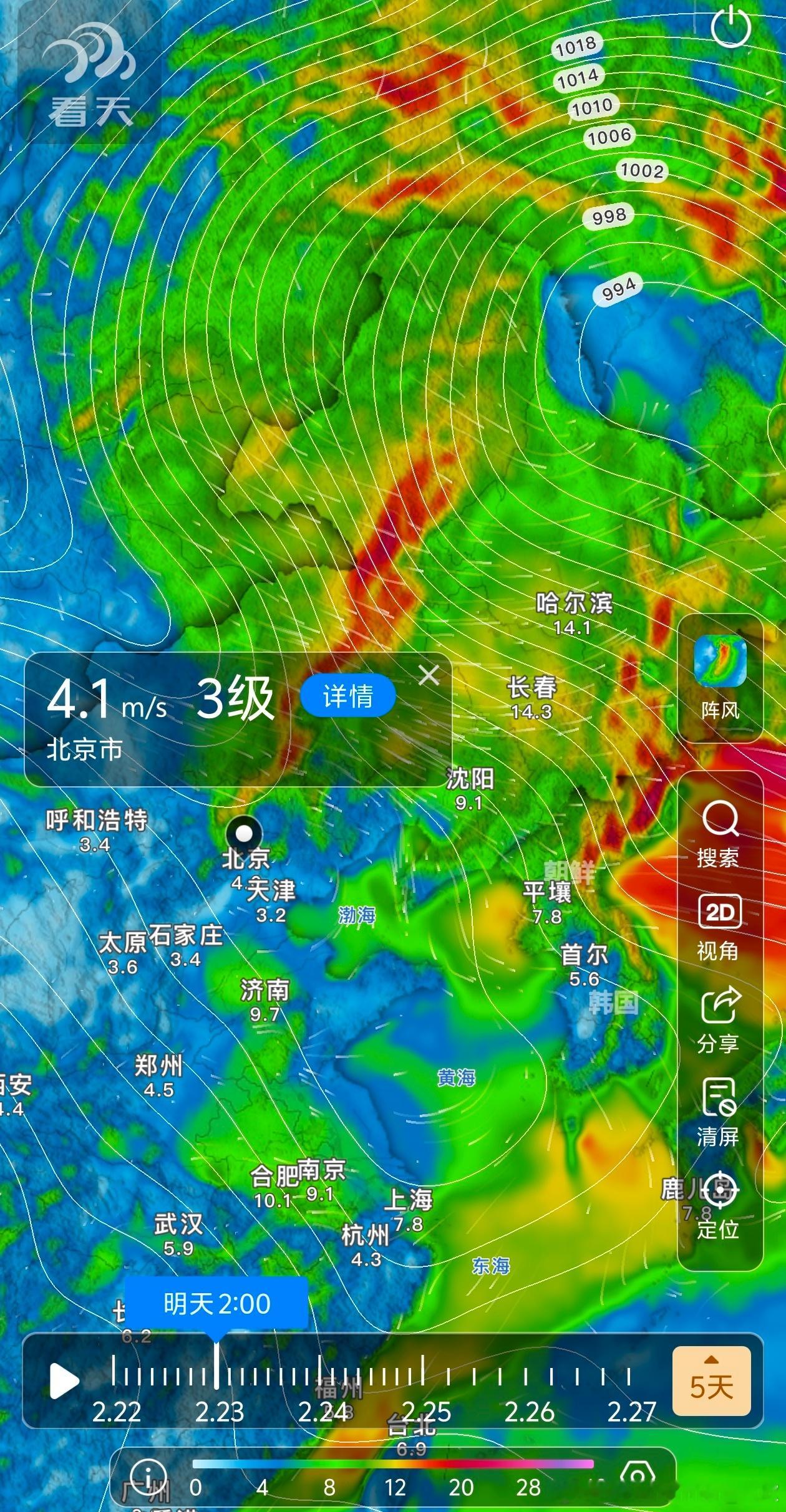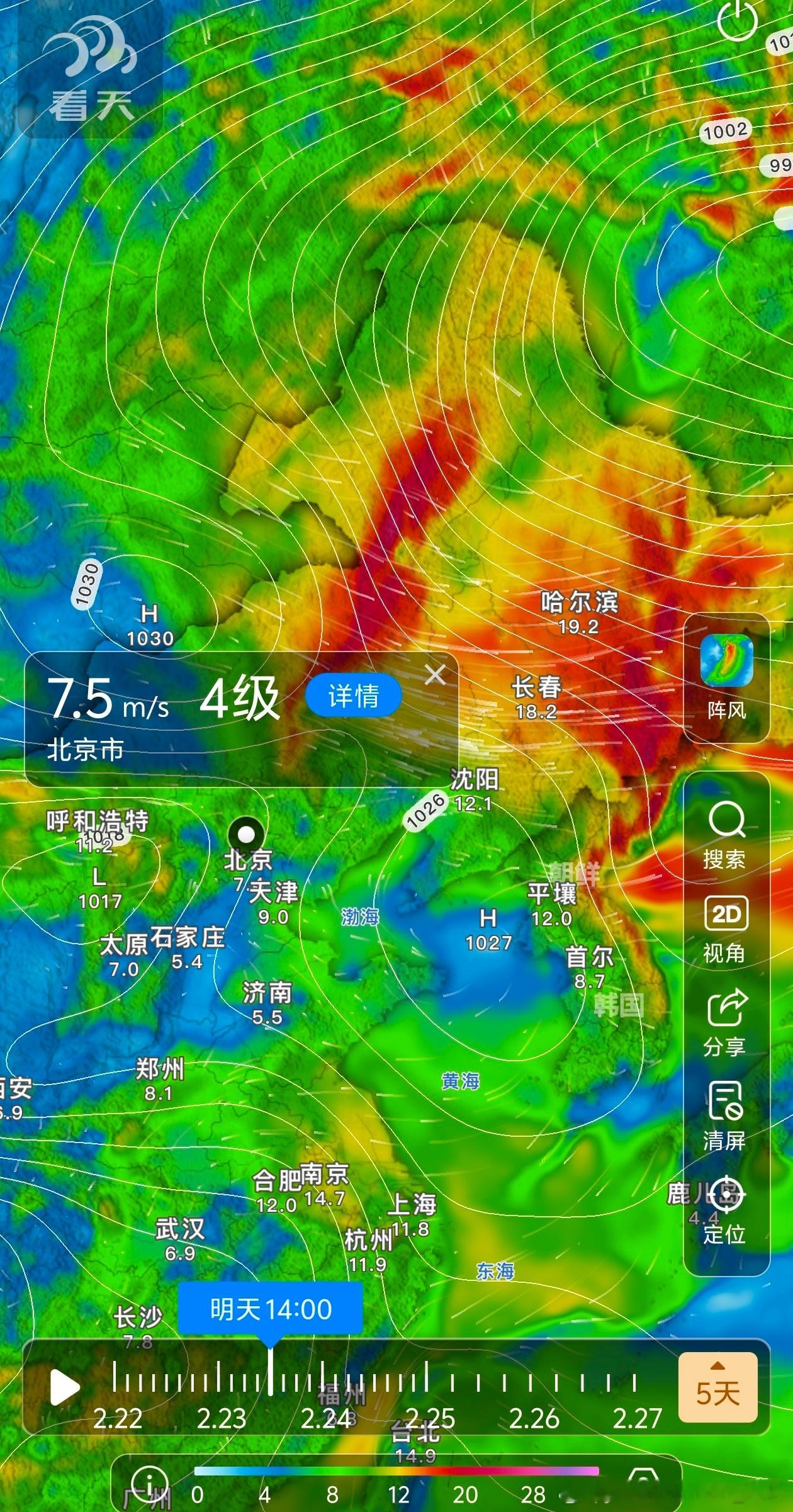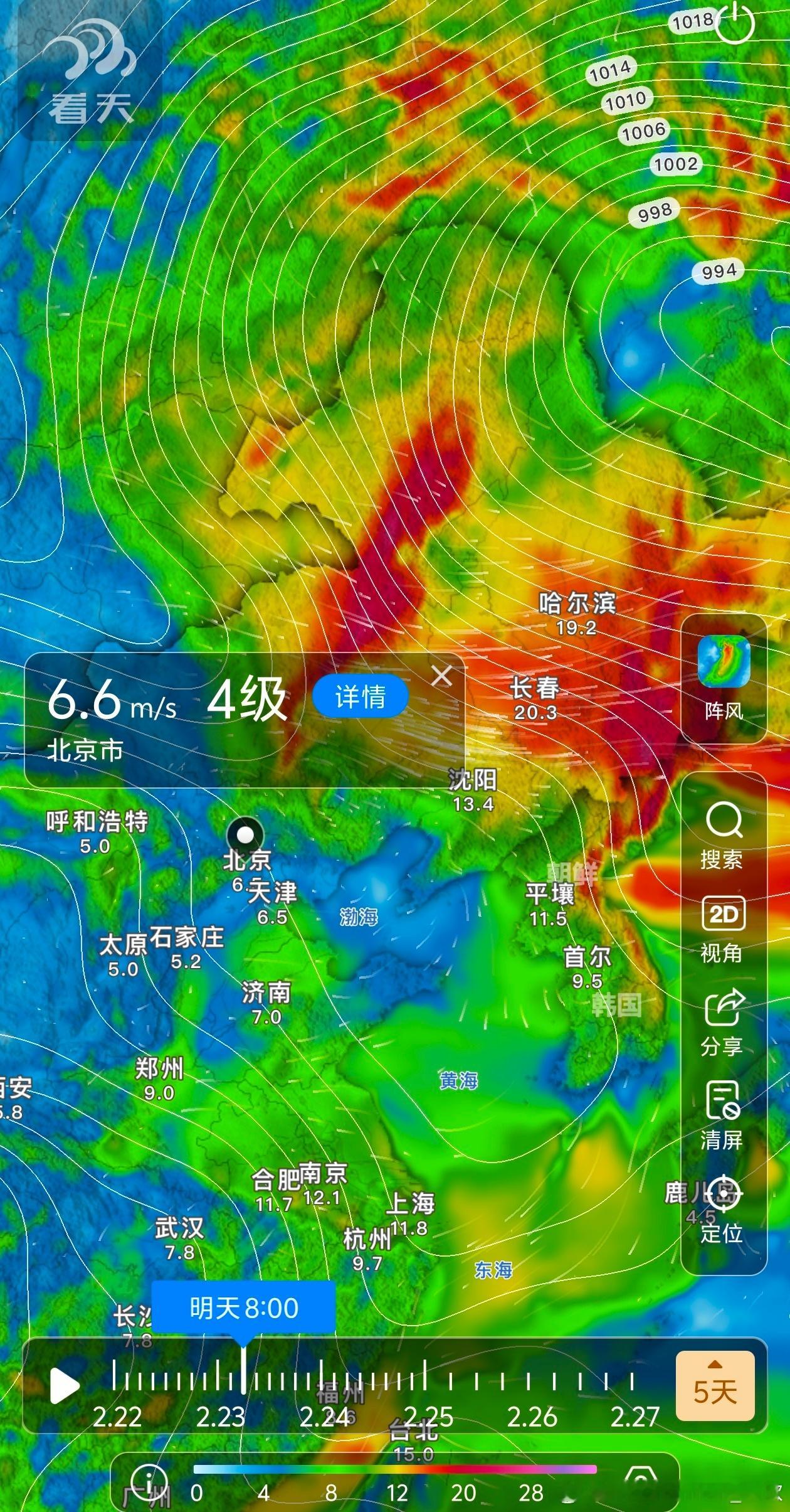【大风】今天因为气压梯度大(等压线很密集),内蒙古东部、吉林、黑龙江多地出现大风。内蒙古中部、河北北部、北京、天津,因为高空动量下传,中午-下午阵风较大,但日落后,风速明显减小。明天在内蒙古东部、黑龙江、吉林可能是气压梯度+动量下传,导致阵风还有7-9级。华北一带明天中午-下午,阵风也可能有4级。