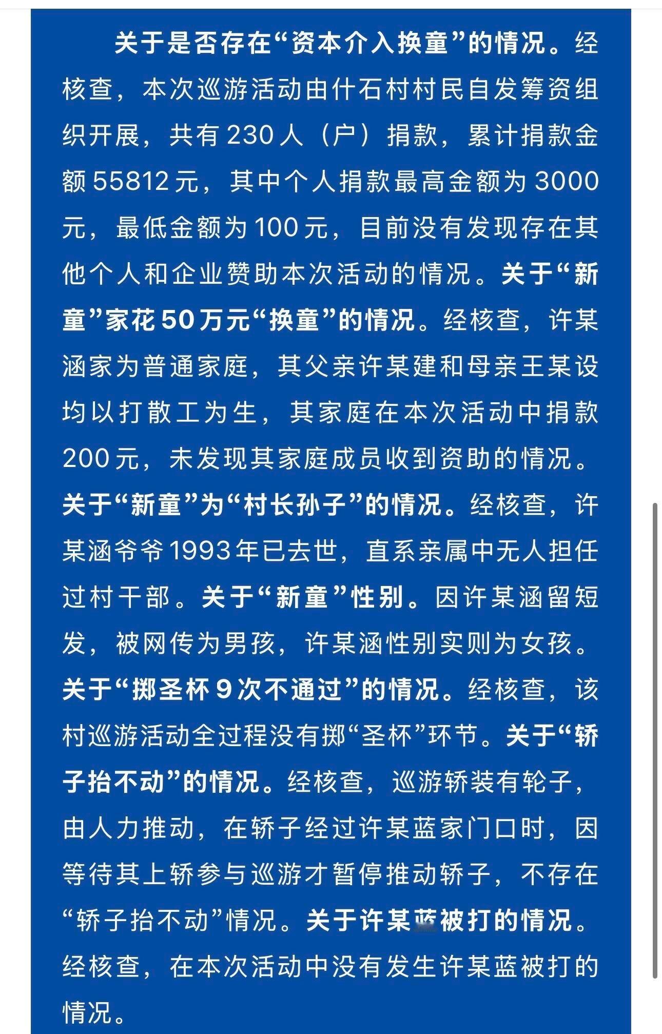 -关于“新童”家花50万元“换童”的情况。经核查,许某涵家为普通家庭,其父亲许某建和母亲王某设均以打散工为生,其家庭在本次活动中捐款200元,未发现其家庭成员收到资助的情况。-关于“新童”为“村长孙子”的情况。经核查,许某涵爷爷1993年已去世,直系亲属中无人担任过村干部。-关于“新童”性别。因许某涵留短发,被网传为男孩,许某涵性别实则为女孩。-关于“掷圣杯9次不通过”的情况。经核查,该村巡游活动全过程没有掷“圣杯”环节。-关于“轿子抬不动”的情况。经核查,巡游轿装有轮子,由人力推动,在轿子经过许某蓝家门口时,因等待其上轿参与巡游才暂停推动轿子,不存在“轿子抬不动”情况。-关于许某蓝被打的情况。经核查,在本次活动中没有发生许某蓝被打的情况