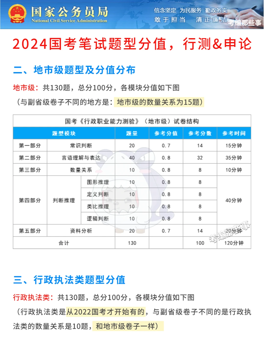 ⭕副省级共135题、地市级和行政执法类共130题,总分都是100分