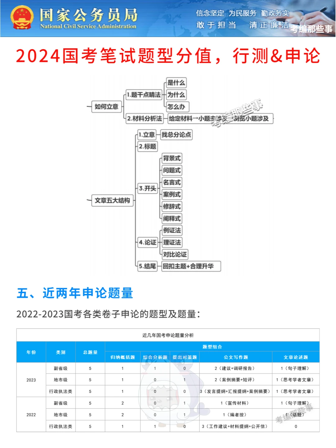 ⭕题型:行测(言语理解与表达、数量关系、判断推理、资料分析、常识判断)+申论(归纳概括题、综合分析题、提出对策题、公文写作题、文章论述题)