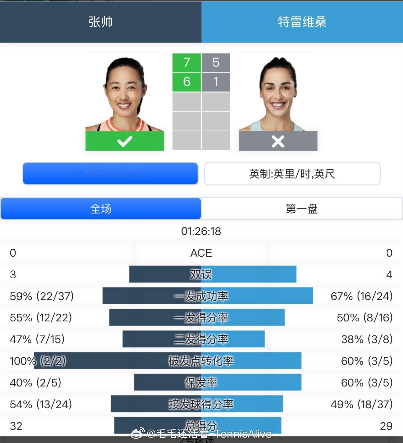 张帅7-5 6-1特雷维桑打进梅里达500正赛。拿到25分、至少12700美金。即时排名86位。