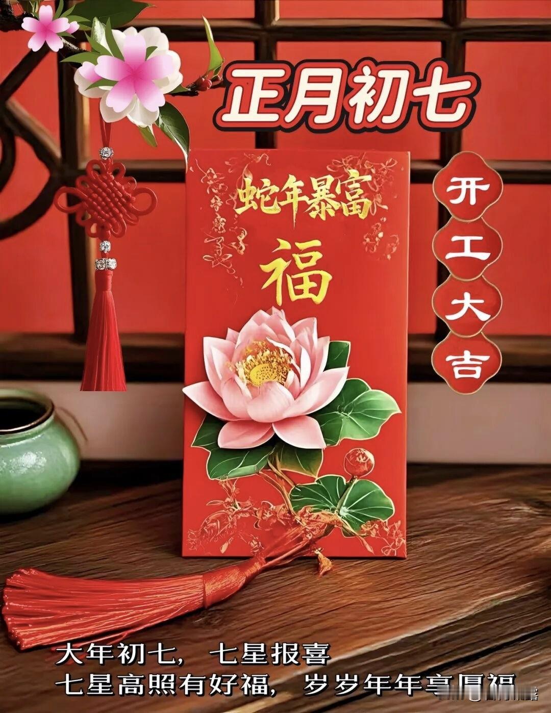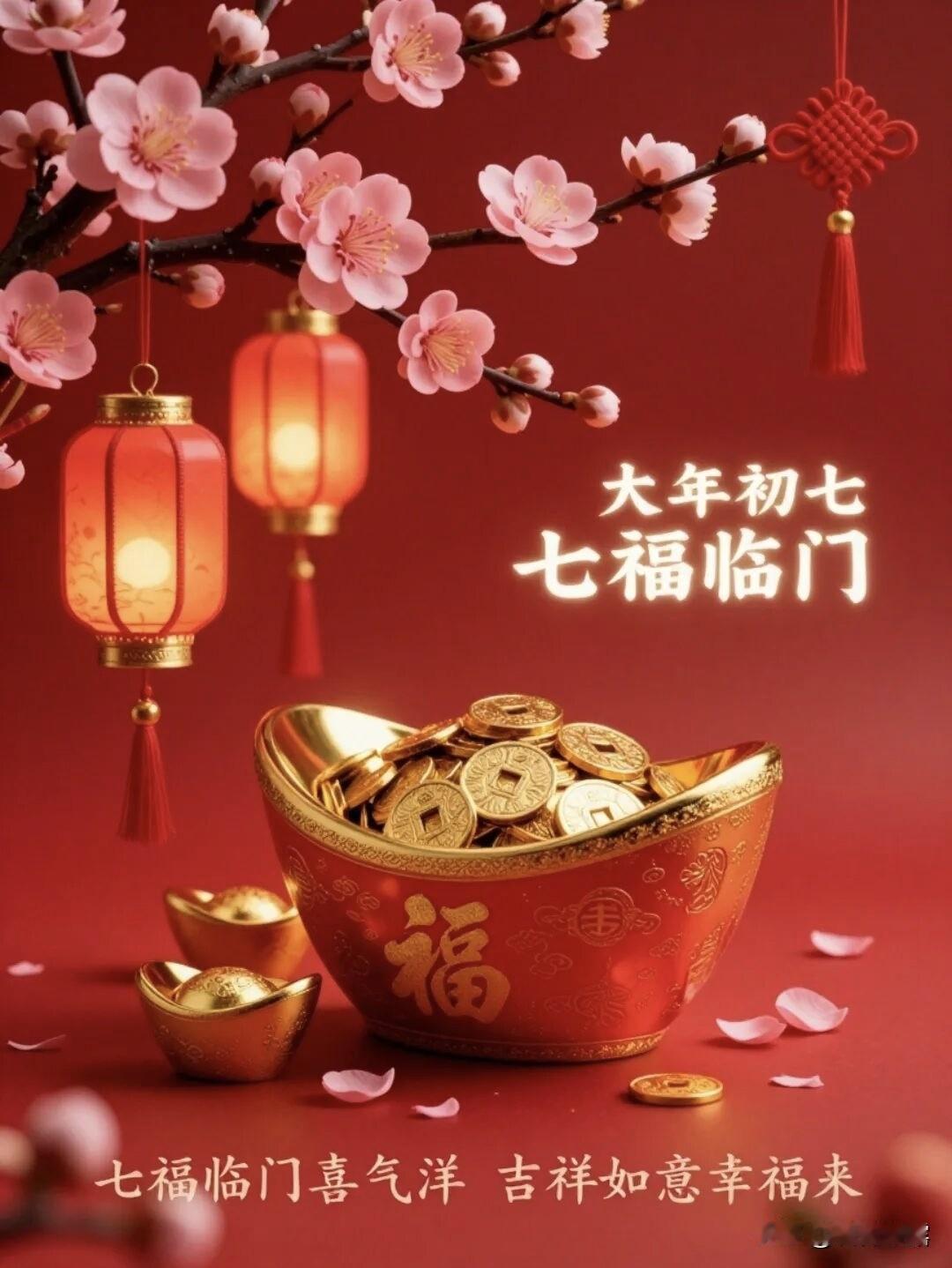 大年初七,七星报喜,福气满满。愿你岁岁安康,家和谐美满,事业兴旺,财源广进,万事