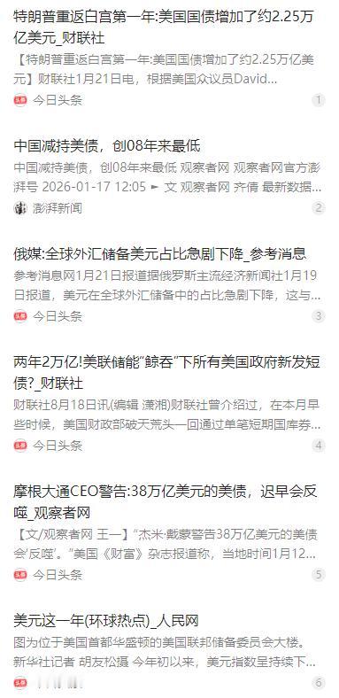 为何美国欠债38万亿,还能撑起11艘航母?其实我们被忽悠了,美债38万亿,已经不是天文数字,是宇宙数字了。 麻烦看官老爷们右上角点击一下“关注”,既方便您进行讨论和分享,又能给您带来更多优质的内容,感谢您的支持!   提起美国的 38.4 万亿美元国债,很多人都会觉得这是个遥不可及的天文数字,可偏偏这个扛着巨额债务的国家,还能养着 11 艘现役核动力航母,这背后的关键,根本不是美国家底厚,而是美债从一开始就不是普通的国家债务,而是靠着美元霸权搭建的全球金融游戏规则。   美债能撑到如今的规模,核心就是美元的全球地位。作为全球主流的结算、储备和避险货币,美国成了唯一一个能用本币向全世界借钱的国家,印钞机握在自己手里,自然不用愁还不上钱,这也是美债看似高危,却始终没人担心它违约的原因。   也正因如此,美债从来都不是没人要的 “烫手山芋”,反而成了全球资本争抢的香饽饽。不管是各国央行还是国际投资机构,都愿意把美债当作资产配置的重要部分,毕竟在全球金融体系里,美债依旧是最具流动性的安全资产之一。   很多人以为美国被海外债主拿捏,可真实情况恰恰相反。美债的最大持有者从来都不是其他国家,而是美联储、美国各州政府、养老金机构这些本土主体,海外持有量只是其中一部分,根本谈不上对美国形成债务围堵。   即便海外持有美债的规模创下过新高,各国的出发点也只是为了稳定本国的外汇储备,让手里的外汇资产有个稳妥的去处。就像日本、英国常年位列美债海外持有量前列,哪怕中国有所减持,也有挪威、加拿大等国补位,海外持有端一直相对稳定。   而美国养着的 11 艘航母,也绝不仅仅是为了彰显军事霸权,更是维护美元体系的重要工具。航母编队游弋在全球各大航道,保障着国际航运和能源运输的安全,也维系着美国主导的地缘政治秩序,这背后的本质,是保障全球对美元的持续需求。   试想一下,全球贸易和能源交易大多用美元结算,航道安全由美国保障,各国自然离不开美元,进而也会继续持有美债,这就形成了一个循环:航母支撑美元霸权,美元霸权又让美债有了持续的信用支撑,美国靠着这个循环,一边发债一边维持军事存在。   当然,38.4 万亿美元的美债,也不是一点代价都没有。美国的财政早已被巨额债务拖累,光是债务利息支出就成了大问题,2025 年最后三个月,美债利息支出就高达 2760 亿美元,2024 财年的年利息更是首次突破万亿美元,超过了不少国家的全年 GDP。   不断攀升的利息支出,正在持续挤压美国的财政空间,让政府在民生、基建等领域的投入都受到限制,这就像一种慢性病,慢慢侵蚀着美国的经济根基。摩根大通的 CEO 就直言,这样无限制的借贷迟早会反噬,只是时间早晚的问题。   更让美国头疼的是,美元的全球地位已经开始松动。2020 到 2026 这六年里,美元在全球外汇储备中的占比跌了近 14 个百分点,创下了至少 20 年的新低,越来越多的国家开始推进本币结算,去美元化的趋势已经显现。   人民币的国际地位则在稳步提升,全球外汇储备中的占比从 2020 年的 2.2% 涨到了 2026 年的 6.5%,中国和数十个国家签署了本币互换协议,数字人民币的用户和交易额也在快速增长,这些都在冲击着美元的主导地位。   黄金也成了各国央行的重要选择,甚至取代美债成了全球最大的储备资产,这意味着全球金融体系正在从单一的美元主导,向多极化方向转变。美国很清楚,一旦美元的霸权地位不再,美债的信用基础就会彻底动摇,这比债务本身更可怕。   所以美国才会对任何去美元化的行为保持高度警惕,无论是在地缘政治上制造冲突,还是在经济上搞制裁,本质都是为了维护美元的主导地位。毕竟只要美元还是全球第一货币,美债就有接盘者,航母的军费就有来源,这个游戏就能继续玩下去。   说到底,我们看到的美债和航母,只是美国全球霸权的两个表象,背后是美元体系支撑的金融逻辑。38.4 万亿的数字看似吓人,却因美元霸权有了存在的土壤,而美国所有的动作,都是为了守住这个让其屹立多年的核心根基。   但时代已经变了,全球金融体系的多极化趋势不可逆转,美元霸权的松动已是事实,即便美国还能靠着航母和美元体系撑住当下的局面,可巨额债务的慢性病和去美元化的大趋势,终究会让这个循环慢慢走向破裂,这也是美国如今最大的隐忧。