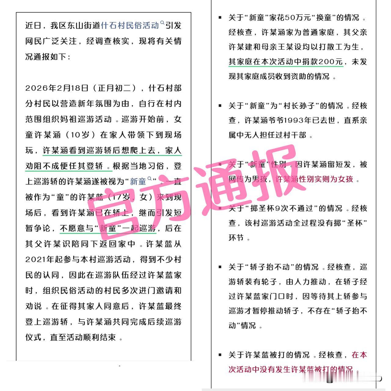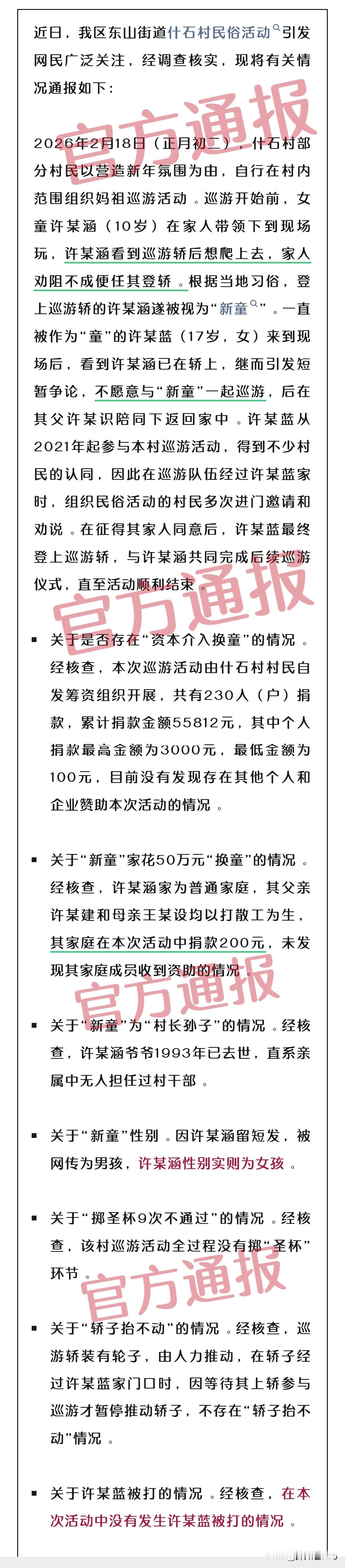 官方通报:「妈祖乩童被替换」 事件 惊天反转,通报(下图)解读,主要是4点→ 1、没有“替换”,是小孩贪玩爬上轿子,造成误会,“妈祖女孩”看到轿子上的小孩后不开心,不愿意与贪玩小孩一同上轿参加活动,造成误会闹剧; 2、没有资本介入,是村民自行集资,“贪玩小孩”家仅捐了200元; 3、轿子抬不动,是谣言,轿子不动是在等待“乩童女孩”上轿; 4、“掷圣杯9次不通过”是传言,该活动没有掷圣杯环节。 从通报上看,把网传得沸沸扬扬的「妈祖乩童被替换」事件的各种“资本介入”、“村中话事人强硬换人”、“妈祖不同意,所以轿子抬不动”......传言一一否定,还原了事实真相。 🤔对于这通报,有网友也提出了一些疑问: 1、谣言出自何处?将会如何处理始作俑者? 2、“乩童女孩”为何要发视频说“被保护得很好”? 3、如此盛大庄重且神圣的活动,为何能无视规矩,任意让“贪玩小孩”破坏规矩,造成如此闹剧呢? 或许,以上种种只有当事者和举办方才更了解真相。 👉作为“贪玩小孩”家长,应该及时教育制止,不能因为年龄小和贪玩,而让不懂事的小孩任性破坏规则,规则不会因为年龄而宽恕任何人。 👉作为举办方,应该明确活动规则,严格把控整个活动流程、环节,才能把活动办得更好。 👉作为吃瓜群众,也应该相信官方通报的真相,秉持不造谣、不信谣、不传谣的态度看待,营造清净、有序、健康的网络空间! 这次湛江「妈祖乩童被替换」事件,你怎么看? (来源:南方都市报、极目新闻)