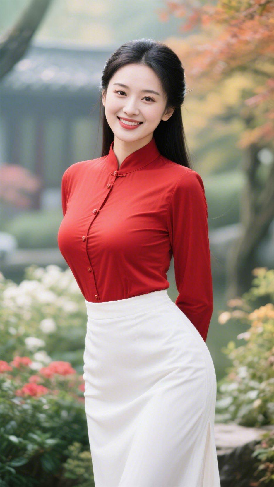 红衣映秋,眉目生暖 风裹桂香漫过园隅,她静立其中,笑意温煦。朱红立领衬着舒展的肩线,襟前盘扣错落如轻缀的细纹,眉目间晕开的柔意,随秋光轻轻漾开。 身后枫叶浅染绯色,素白裙裾掠过石阶时,带起细碎花影——像把秋日的清宁,都织进了这一瞬的光景里。 寻常日子本自安然,却总有人将烟火过成舒展的诗。她笑时的神情,比枝间的红更轻柔,比风里的香更妥帖,让人忽然觉出:这人间的寻常光景,原是这般明媚可亲的。