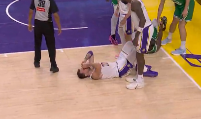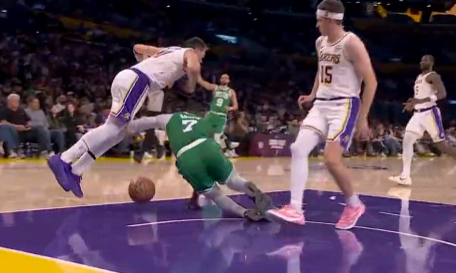 第二节比赛,布朗失去平衡下撞倒东契奇,后者经过短暂调整后重新站起来。