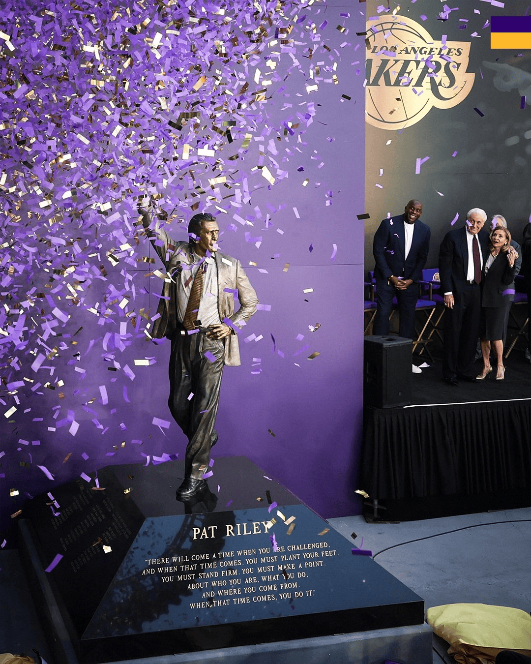 魔术师约翰逊、德维恩-韦德、贾巴尔、珍妮-巴斯、迈克尔-道格拉斯(知名演员制片人)出席雕像揭幕仪式。