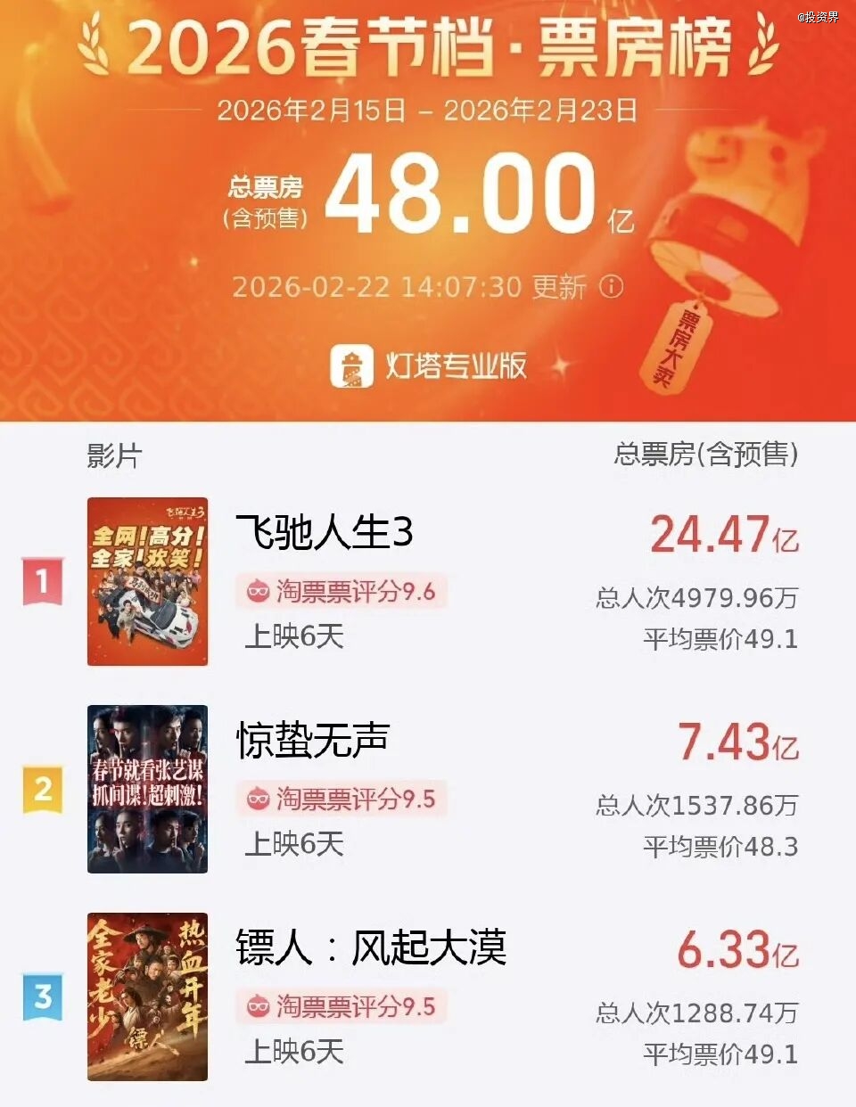 据灯塔专业版数据发布,截至2月22日14时07分,今年春节档(2月15日-2月23日)档期总票房(含预售)突破48亿元,影片《飞驰人生3》《惊蛰无声》《镖人:风起大漠》分列前三位。