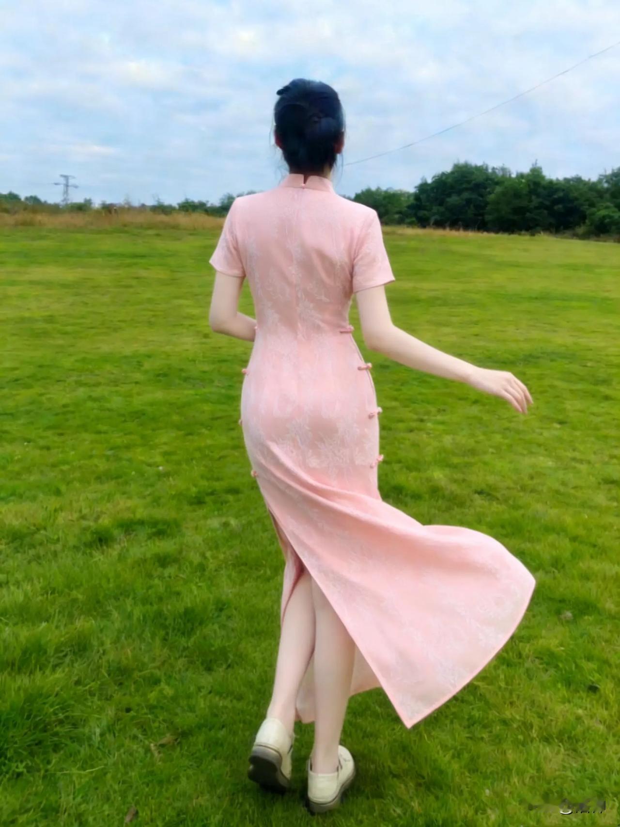 旗袍女子轻转身姿,粉色缎面旗袍随动作轻柔摇曳,暖柔光线勾勒温婉侧脸,体态丰腴圆润