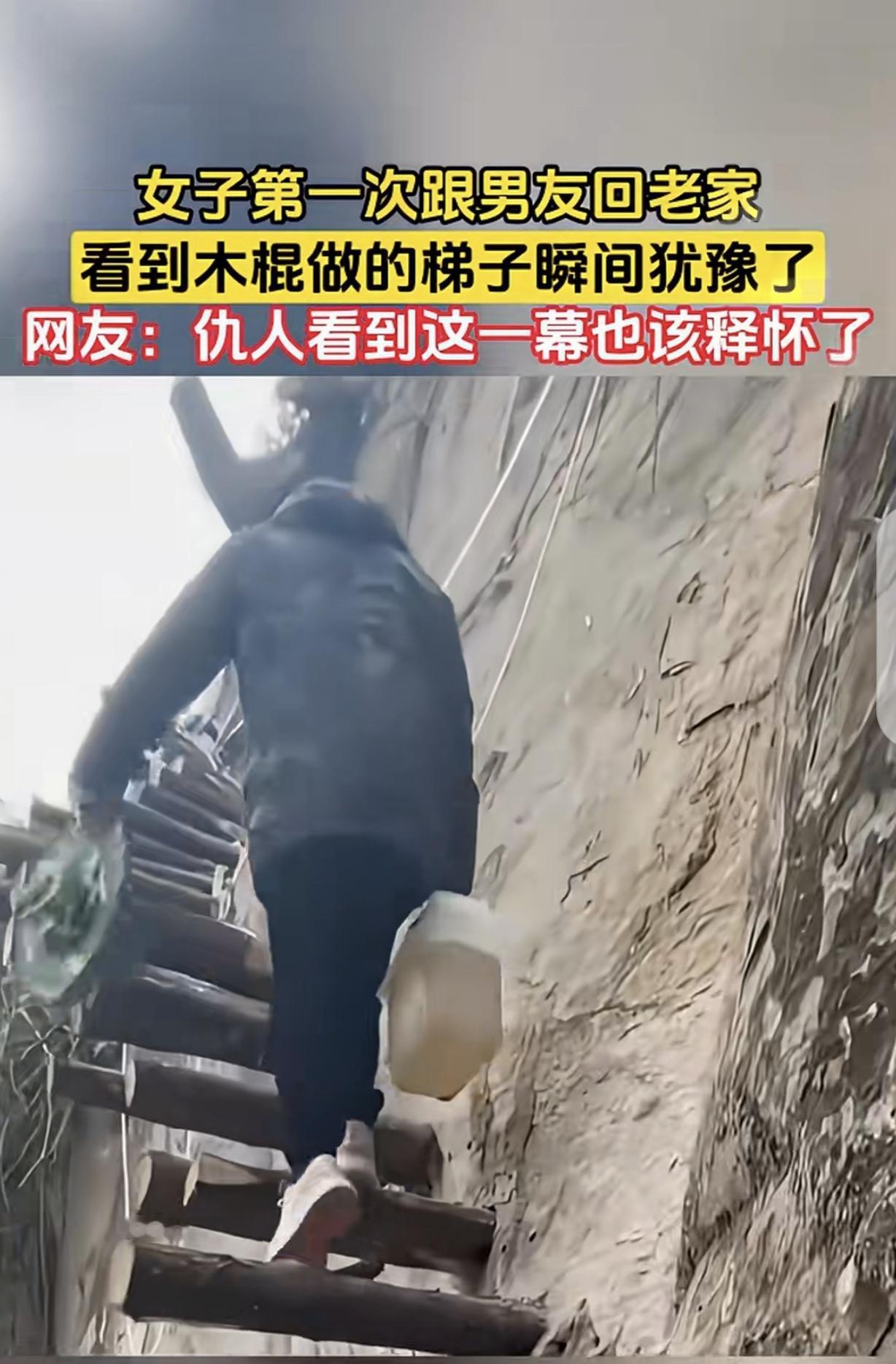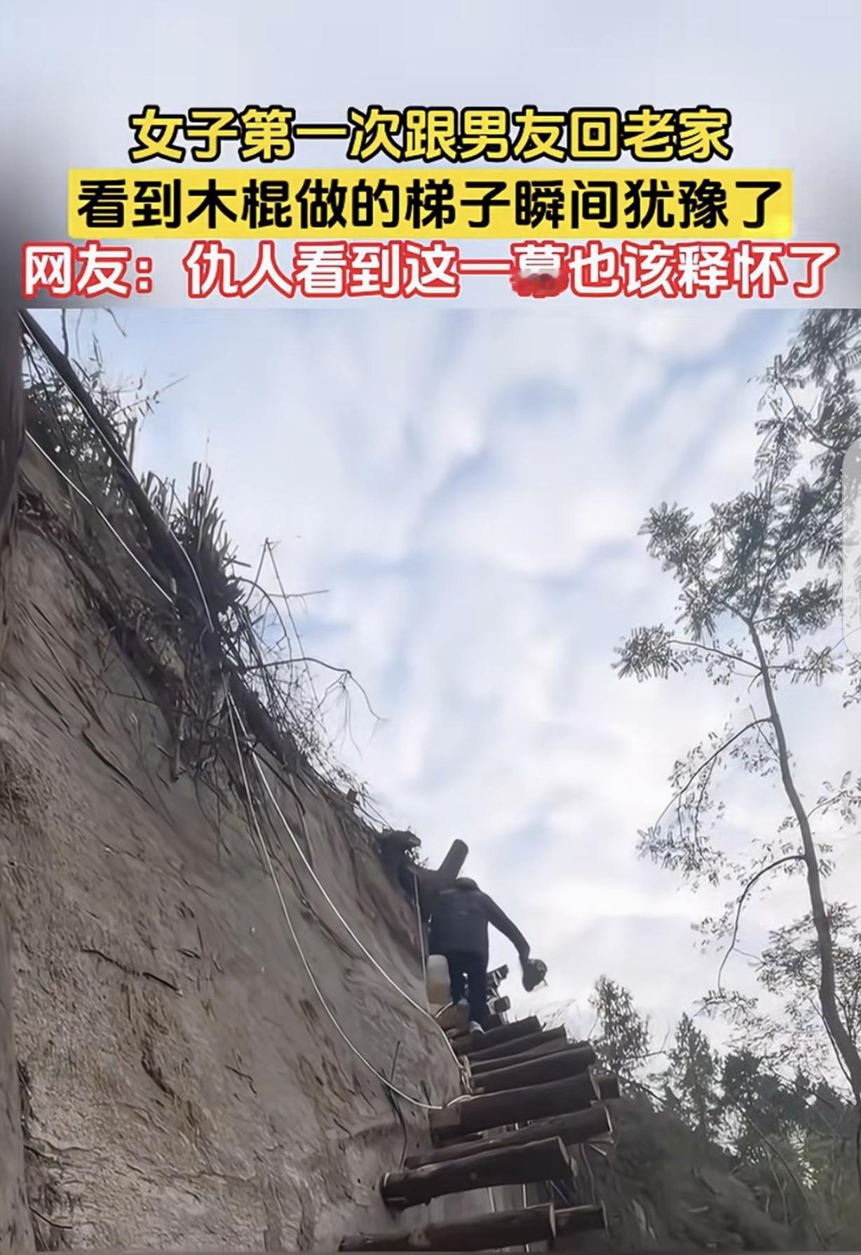 “高德地图都找不到的地方,被你这个恋爱脑找到了!”河南,一女子跟男友回他老家见父母,可到了男子家门口,把她吓破胆,双腿直哆嗦,压根不敢上门,她如果嫁给男友,那就成了妥妥的压寨夫人了。网友:你嫁进大山只需要一天,你孩子走出大山却需要一辈子。 一女子跟着相爱多年的男友,回河南老家见他父母,本来心里就有点紧张,可下车后眼前的路,直接把她吓得腿肚子都软了。 这哪是回家的路啊,简直就是现实版的“天梯”。 山路崎岖,走到一半就没了正经台阶,取而代之的是插在岩壁上的木棍。 木棍粗细不一,有些看着还摇摇欲坠,只能当临时梯子用。抬头望上去,梯子几乎垂直于地面,旁边光秃秃的连个扶手都没有,风一吹,人站在上面都能感觉到晃动。 男友倒是习以为常,拎着一桶将近20斤的油,手脚麻利地就往上爬,还回头喊她:“别怕,跟着我踩准木棍就行,我拉着你。” 可女子站在底下,看着那些单薄的木棍,脑子里全是自己脚滑摔下去的画面。 她越想越怕,站在原地不敢动,双腿一个劲儿地哆嗦,连迈步的勇气都没有。 这万一踩滑了,下面可是悬崖峭壁,摔下去直接就成肉泥了啊! 女子心里直发慌,忍不住跟男友抱怨。可男友却说,老家这边的人都这么走,走习惯了就没事,让她放宽心。 女子咬咬牙,心一横抓着男友递过来的手,小心翼翼地踏上第一根木棍。 刚踩上去,木棍就发出“咯吱”的声响,吓得她瞬间僵住,大气都不敢喘。 每往上爬一步,她都死死盯着脚下的木棍,不敢往两边看,手心全是冷汗。 好不容易爬到顶,她瘫在地上半天缓不过神来,心里直打鼓:这要是嫁过来,以后回家都得跟闯关一样,这压寨夫人可不好当。 这事传到网上,网友们纷纷调侃,说这比令狐冲去见任盈盈还惊险,至少人家还有竹篮子兜底。 女子事后说,虽然知道男友老家条件艰苦,可真没想到要爬这么危险的路,现在只盼着以后老家能把路修修,别再让人担惊受怕了。 有人说,所以找不到女朋友跟有没有钱没关系,主要还是看人会不会忽悠。去的时候牵着手去的,回来的时候手揣着手回家的。 说实在能在这住的都不是一般人,这个道太难开了,如果这次女子要求在城里买房我觉得一点都不过分。 我儿子天天在120的大宅子里玩游戏,咋就找不到个女朋友呢?我很好奇这木头是怎么装上去的,总感觉过得了初一过不了十五就要掉下去。 相信父母的选择,会难过一阵子两三年,自己选择会高兴两三年后悔一辈子,你可以不信,你往前走一步,你的孩子就是用一辈子怕也走不出来。 这种场景只怕是在梦里才能遇到,而且还是惊梦、半夜要惊醒那种,还得惊出一身冷汗那种。 女子跟着男友回老家,却被那“天梯”似的山路吓得不轻,这事儿在网上引发了热议。 有人觉得女子太娇气,可换位思考,谁站在那摇摇欲坠的木棍梯子上,能不害怕呢?毕竟下面就是悬崖峭壁,稍有不慎就可能万劫不复。 男友觉得老家的人都这么走,没什么大不了,可这恰恰反映出他可能没站在女子的角度考虑问题。 婚姻不是两个人的事,还涉及到未来的生活环境。女子担忧以后回家都要“闯关”,这并非无理取闹。 网友们调侃“你嫁进大山只需要一天,你孩子走出大山却需要一辈子”,这话虽然扎心,但也不无道理。 生活环境对下一代的影响巨大,谁不希望孩子能有个更好的成长环境呢? 当然,爱情是美好的,但也不能忽视现实因素。女子提出在城里买房的要求并不过分,这是她对未来生活的一种保障。 而男友也应该理解女子的担忧,积极沟通,共同寻找解决办法,而不是一味地让女子去适应老家的艰苦环境。 《民法典》第1043条规定,夫妻应当互相忠实,互相尊重,互相关爱;家庭成员应当敬老爱幼,互相帮助,维护平等、和睦、文明的婚姻家庭关系。 在此案例中,男女双方在面对婚姻生活环境差异时,应依据此法条,相互尊重、理解对方的想法和担忧,一起协商解决未来生活规划问题,以维护平等、和睦的婚姻家庭关系。 对此,你怎么看?