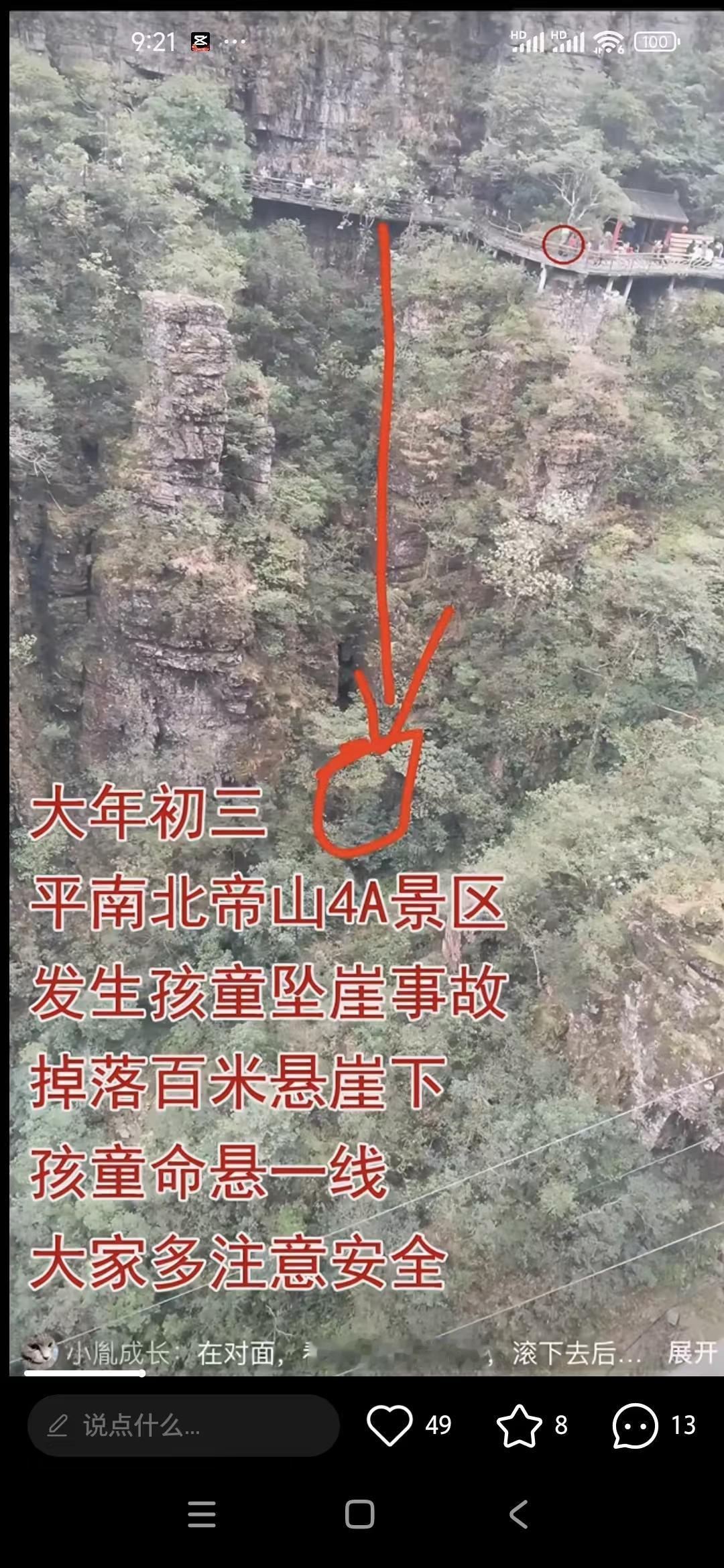 北帝山坠崖10岁男童身体多处骨折,22号摔后第三天跨省转院治疗。 小男孩是广东人,家中独子,初三下午他和家人到北帝山游玩,在图二、图三标记的地方踩空坠落,救援人员花两个多小时才找到他。 就是竹竿和山体之间,有个倾斜的洞,不直着从上往下看并不容易发现,而且旁边未见有警示牌。 不排除是向下的排水沟,但这个空洞的大小是可以掉孩子的,的确存在安全隐患。 男孩家属说孩子身体多处骨折,头、腰椎和腿最严重,正赶上春节,要等专家评估。 往好想,从这么高的地方坠崖还活着,也是不幸中的万幸吧!
