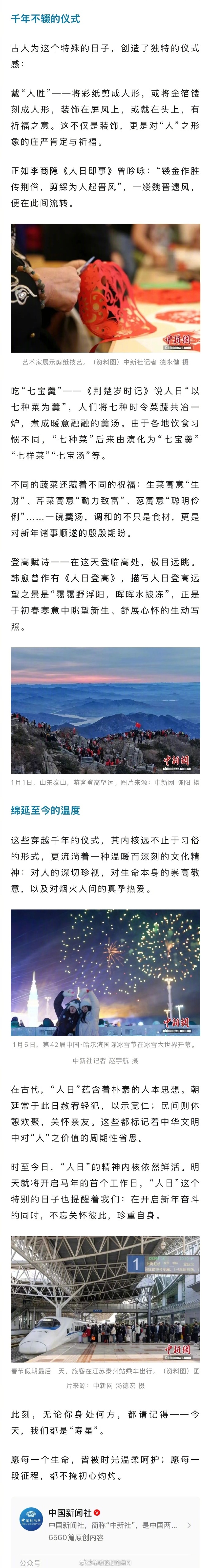 【#为何正月初七被称为人日#】#今天我们都是寿星# 今天(23日),丙午年正月初七。当晨光染红新贴的窗花,炊烟在清冷的空气中写出第一笔温柔,你可曾察觉——今日的风里,藏着一份古老的浪漫?这不仅是大年初七,更是一个镌刻在中国人时间密码里的浪漫日子——“人日”。人人生日,万物可爱。今天,我们皆为“寿星”。为何正月初七被称为“人日”?