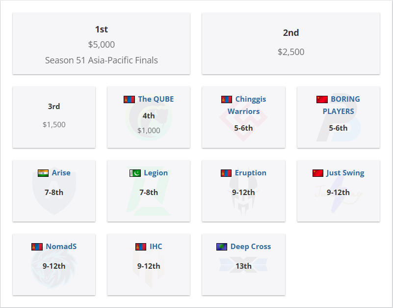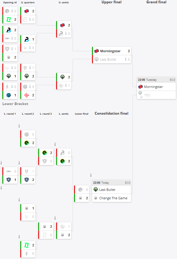 目前,前三名均被中国战队包揽。Morningstar将在总决赛静候LastBullet与CTG之间的胜者。冠军将获得5000美元奖金和亚太总决赛的参赛资格。