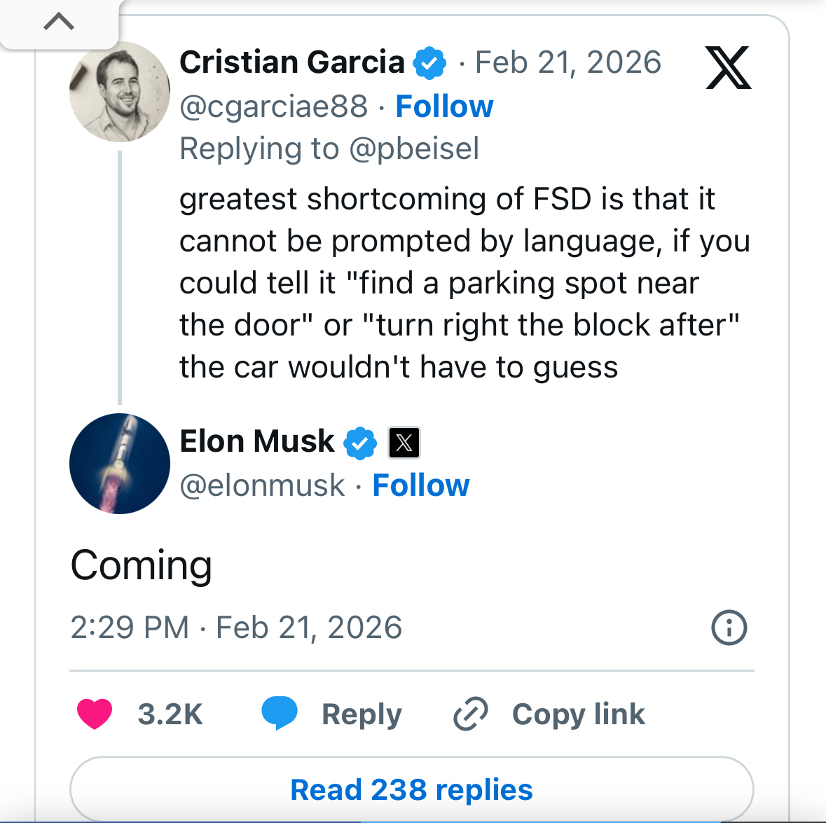 马斯克在社交平台上确认了一个绝对是史诗级的更新:特斯拉的 FSD(完全自动驾驶)马上要支持“自然语言语音指令”了! 这是啥概念?以前咱们用各种高阶智驾,车子就像个只会死看导航的“木头人”。比如导航到了商场,你想让它停在离大门近一点的位置,或者看前面堵车想让它提前一个路口拐弯,它根本听不懂你的暗示,你只能无奈地自己接管方向盘。 但这次更新后,你可以直接像使唤真人司机一样对它喊:“嘿,帮我找个离电梯最近的车位”,或者“前面那个路口右转,找个没人的角落倒进去”!