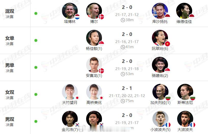 男单:安赛龙🇩🇰女单:杨佳敏🇸🇬男双:金元昊/徐承宰🇰🇷女双:大竹望月/高桥美优🇯🇵混双:塔伯林🇳🇱/博尔🇩🇰