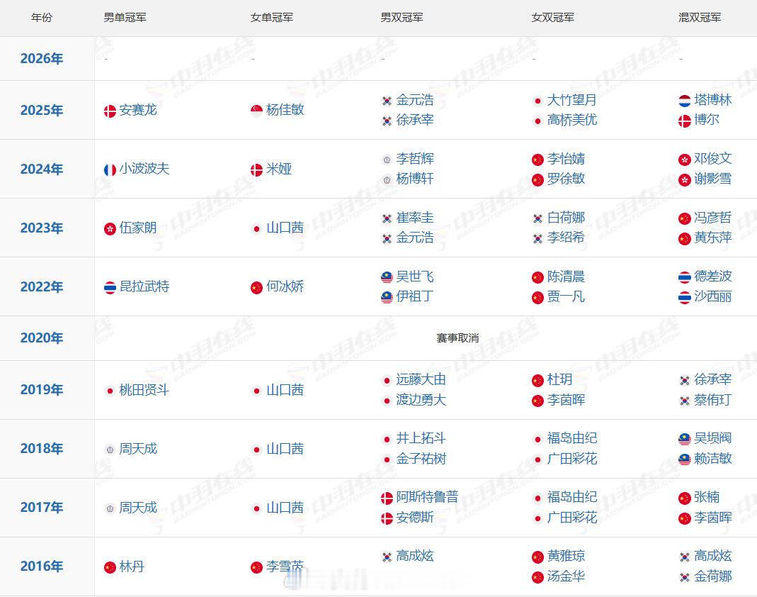 2026年德国羽毛球公开赛上届/近10年卫冕冠军🏆