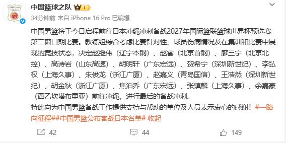 中国男篮正式公布14人名单,后卫线只能用失望透顶来形容。中国篮球之队兑现承诺,按他们的说法真的在今天早上正式公布了2027年国际篮联篮球世界杯预选赛第二窗口期比赛的14人名单,他们是:赵继伟、赵睿、廖三宁、高诗岩、胡明轩、贺希宁、李弘权、朱俊龙、赵嘉义、王浩然、胡金秋、焦泊乔、张镇麟、余嘉豪。虽然这次郭士强征召了贺希宁、李弘权、王浩然一些新面孔,也非常符合球迷的心愿。但后卫线郭士强仍然是迷信他的一些不堪中用的弟子,赵继伟十年来证明是外战外行,高诗岩在联赛就是一个普通的后卫,胡明轩已低迷了一年,状态极差,三分命中率只有两成多,可以说赵继伟、高诗岩和胡明轩都没有篮子,赵继伟打个蒙古一分不得,被戏称是“赵零儿”,胡明轩和高诗岩被戏称为“胡铁”和“高铁”。如今郭士强仍然迷信这些不中用后卫,真是令人失望透顶。有大心脏的庞峥麟在联赛状态爆棚,可是郭士强就是不用,不得不说郭士强这人太老套了,不是一个能出奇制胜的将帅。你们说呢?