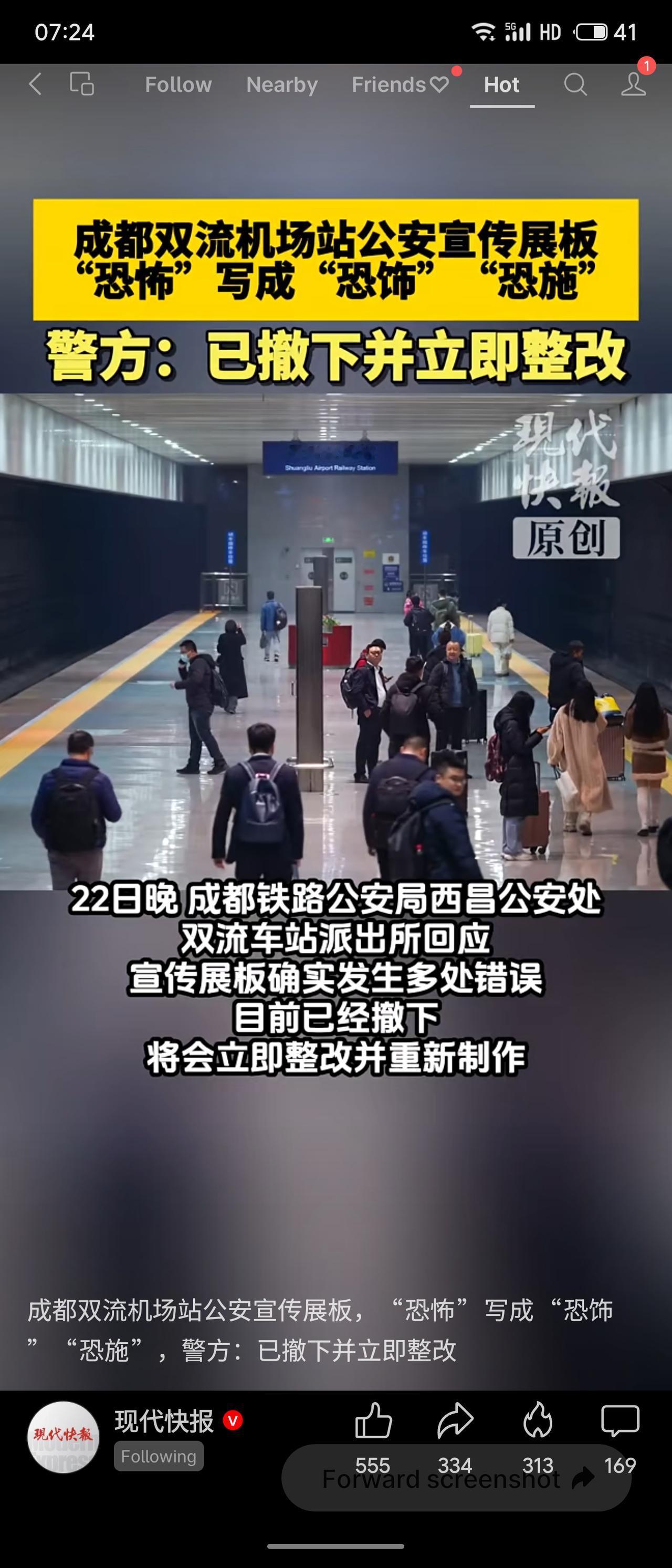 成都双流机场站公安反恐宣传展板出现多处错别字,将“恐怖”写成“恐饰”“恐施”。警方回应已撤下并立即整改。严肃的反恐宣传出现低级文字错误,暴露出制作审核环节的疏漏,有损公信力。