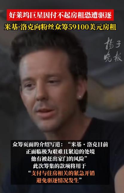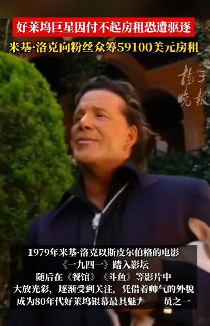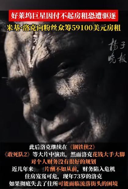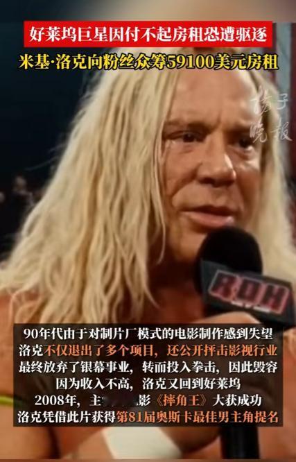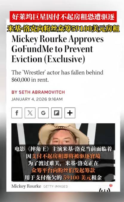 又一个好莱坞巨星被斩杀,曾经风靡万千少女的好莱坞硬汉米基洛克,出演过史泰龙的《敢死队》,一生赚了5000万美元,但是没想到老年成这个样子,这么大腕连房租都交不起了,接下来等待他的就是流浪街头了。 好莱坞的霓虹永远耀眼,可灯光照不到的角落,总藏着明星褪去光环后的真实人生。 73 岁的米基・洛克,这个曾凭一身硬朗气质迷倒万千观众、手握金球奖影帝奖杯、参演作品全球票房逼近 20 亿美元的好莱坞硬汉,正站在无家可归的边缘。 很多年轻观众可能对米基・洛克的名字不算熟悉,但只要看过好莱坞经典动作片,就一定对他那张充满野性的脸有印象。 在踏入演艺圈之前,米基・洛克的人生和表演毫无关联,少年时期的他一心扎在职业拳击赛场,19 岁就正式开启职业拳击生涯,前后征战了 16 场正式赛事,其中拿下 12 场胜利。 可赛场的伤痛也彻底缠上了他,长期的脑部撞击还留下了慢性头痛的后遗症,因为身体实在扛不住高强度对抗,他才不得不告别拳台,误打误撞走进了好莱坞的片场。 上世纪 80 年代,米基・洛克靠着独一份的硬朗气质和原生感演技,迅速在好莱坞杀出重围,短短几年时间就跻身一线男星行列,片约接到手软。 那时的他住洛杉矶半山豪宅,开限量款跑车,走到哪里都被粉丝和媒体包围,是无数少女心中的完美男神,根本不会想到,几十年后自己会被每月几千美元的房租难住。 米基・洛克的演艺生涯里,留下了太多让人难忘的经典角色,2005 年的《罪恶之城》中,他饰演的痴情硬汉马弗,凭借粗犷的外形和细腻的情感表达,成为影史留名的经典形象。 2008 年的《摔角王》更是他的演技巅峰,为了贴合角色他不顾旧伤亲自上阵动作戏,最终拿下金球奖剧情类最佳男主角,还获得奥斯卡最佳男主角提名,业内口碑直接拉满。 可人生的下坡路,总是在毫无征兆时就开始。 红透半边天的米基・洛克始终放不下拳击梦想,在演艺事业巅峰期多次重返拳台,反复的伤病让他不得不接受十多次面部修复手术,仅手术费用就花掉了近千万美元,外形的改变也让他慢慢失去了好莱坞主流市场的青睐。 米基・洛克从来没有理财规划,身边也没有专业的财务团队打理资产,赚来的钱除了高额医疗费,还花在了照顾流浪动物上,他家中长期收养 17 只流浪猫狗。 每月宠物饮食、医疗开销就超过 2000 美元,对朋友他又格外仗义,身边人遇到困难他总会慷慨解囊,没有储蓄、没有投资,千万积蓄在十几年的消耗里慢慢见底。 晚年的他卖掉所有奢侈品和房产,搬进洛杉矶月租 7000 美元的普通公寓,可就连这份基础开销,最后也成了无法承担的重担。 连续 8 个月没能按时缴纳房租后,房东直接向当地法院提起诉讼,法院最终判决米基・洛克限期结清拖欠的租金、滞纳金以及法务费用,总计 59100 美元,逾期就会被强制驱逐。 一辈子要强的硬汉面对这份通知彻底陷入无助,身边好友不忍心看他流落街头,随即在知名众筹平台发起募款,目标金额精准定为 59100 美元,只为帮他还清欠款保住住所。 众筹链接上线后,大批老影迷纷纷出手支援,仅仅 24 小时就筹到了超过 6.5 万美元,不仅足额覆盖房租欠款,还多出了不少后续生活费用。 米基・洛克本人在得知消息后,坦言向粉丝伸手要钱让他倍感屈辱,这位一辈子靠拳头和演技吃饭的硬汉,从未想过自己的晚年要靠陌生人的帮助度日。 从职业拳击手到好莱坞巨星,从千万富翁到欠租被逐,米基・洛克的一生,像一部跌宕起伏的现实电影。 他用拳头和演技,在影史留下了不可磨灭的印记,他经历过万众瞩目的巅峰,也承受着无人问津的低谷,人生的大起大落,都在他 73 年的岁月里真实上演。 好莱坞的星光大道上,依旧刻着他的名字,游客们匆匆走过,很少有人会知道,这个名字的主人,正经历着怎样的人生困境。 娱乐圈的风光从来都是短暂的,再耀眼的明星,也逃不过岁月的侵蚀与人生的无常。 对于这件事,您有什么想说的吗?欢迎评论区留言讨论。 信源:扬子晚报2026-01-05——《好莱坞巨星因付不起房租恐遭驱逐 米基·洛克向粉丝众筹59100美元房租》