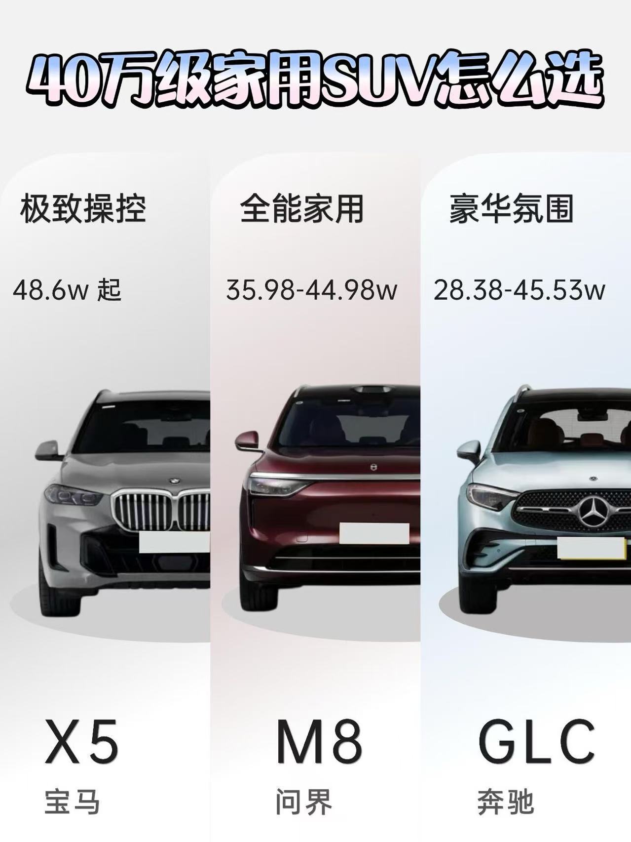 这三款车虽然价格重叠,但定位差异巨大——宝马X5是公路操控之王,问界M8是智能家用旗舰,奔驰GLC则是豪华格调之选。 - 三车核心定位速览 车型 核心优势 适合人群 宝马X5 59.8万起+3.0T 423马力+5.5秒破百+3105mm轴距+48V轻混+智驾Pro+8.5代iDrive 追求德系操控、公路驾驶质感和品牌价值的品质中产 问界M8 35.98万起+392kW双电机+3105mm轴距+5/6座可选+华为ADS 4.0+鸿蒙座舱+800V平台 追求智能科技、家用空间和低用车成本的新锐家庭 奔驰GLC 39.98万起+2.0T+48V轻混+258马力+2977mm轴距+全时四驱+8295芯片+64色氛围灯 追求豪华氛围、品牌调性和精致体验的都市精英 - 宝马X5:59.8万起的“公路操控之王” 2026款X5全系标配M运动曜夜套装,双肾格栅全黑化处理,气场拉满。3105mm超长轴距中国专属,185cm乘客后排腿部超两拳。3.0T六缸版本311kW/423马力,零百5.5秒,48V轻混让启停丝般顺滑,高速油耗可低至8L/100km。全系标配智能驾驶辅助系统Pro,支持“眼神确认自主变道”。真实痛点:2.0T版本仅287马力,预算充足建议直接上3.0T。 - 问界M8:35.98万起的“智能家用旗舰” 2026款M8尺寸越级,5190mm车长+3105mm轴距,提供5座/6座可选,第二排独立座椅带零重力功能,第三排成年人也能舒适乘坐。双电机四驱392kW(约533马力),1.5T增程器声音细如空调外机,WLTC油耗低至0.53L/100km。车顶激光雷达是标配,侧面固态雷达可选装,华为ADS 4.0支持全场景NOA。真实痛点:整备质量2630kg,满载起步需适应。 - 奔驰GLC:39.98万起的“豪华格调之选” 2026款GLC起售价拉低至39.98万,全系标配4MATIC四驱。2977mm轴距同级领先,后排腿部空间两拳三指,地台隆起不高,满员不遭罪。2.0T高功率版258马力,48V轻混加持开起来平顺,智能领航辅助Max全系标配。内饰12.3英寸仪表+11.9英寸竖屏,高通8295芯片驱动第三代MBUX系统,64色氛围灯夜间效果拉满。真实痛点:动力调校偏舒适,激情驾驶别指望。 - 一句话总结:要公路操控买X5 40Li,3.0T+8AT+智驾Pro,德系SUV天花板;要智能家用买问界M8六座版,华为全家桶+800V快充+零重力座椅,新锐家庭首选;要豪华格调买GLC 300L,39.98万起三叉星徽+2977mm轴距+64色氛围灯,都市精英不二之选。