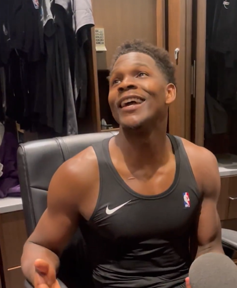“他今天还在我头上扣了一个,我不太喜欢那样(笑)……我当时没意识到他是直接冲着篮下去的,我转了一下头。我还以为他要上篮,结果他直接冲进去暴扣了。”
