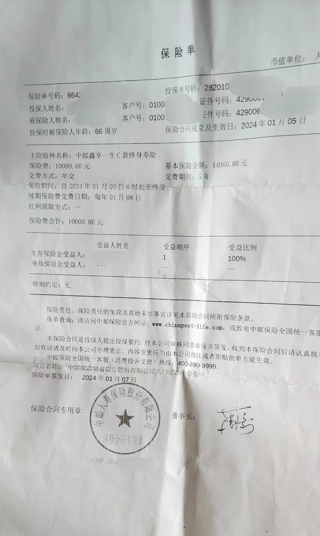陈先生提供的保单照片显示,其母亲所购买的是中邮人寿保险股份有限公司的“中邮鑫享一生C款终身寿险”,缴费期为五年,年缴保费1万元。