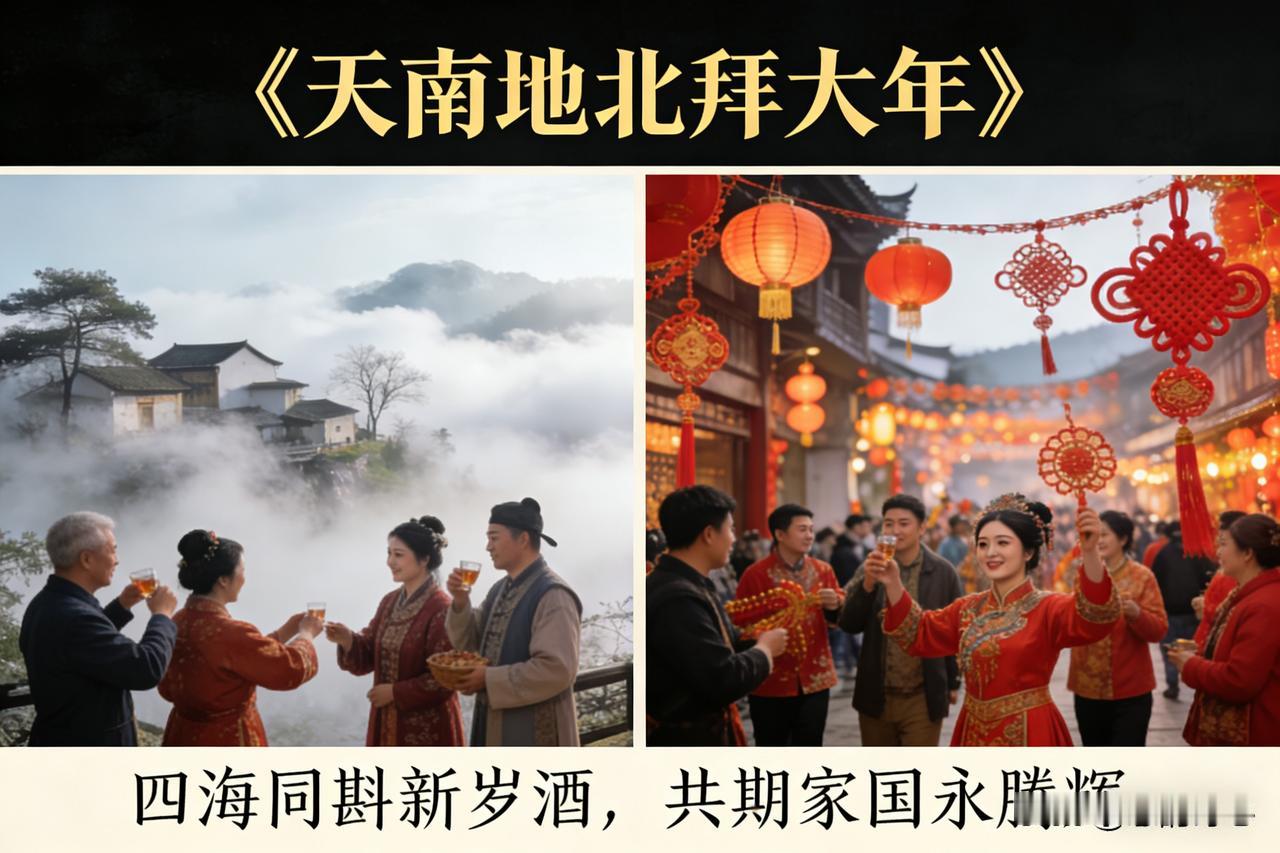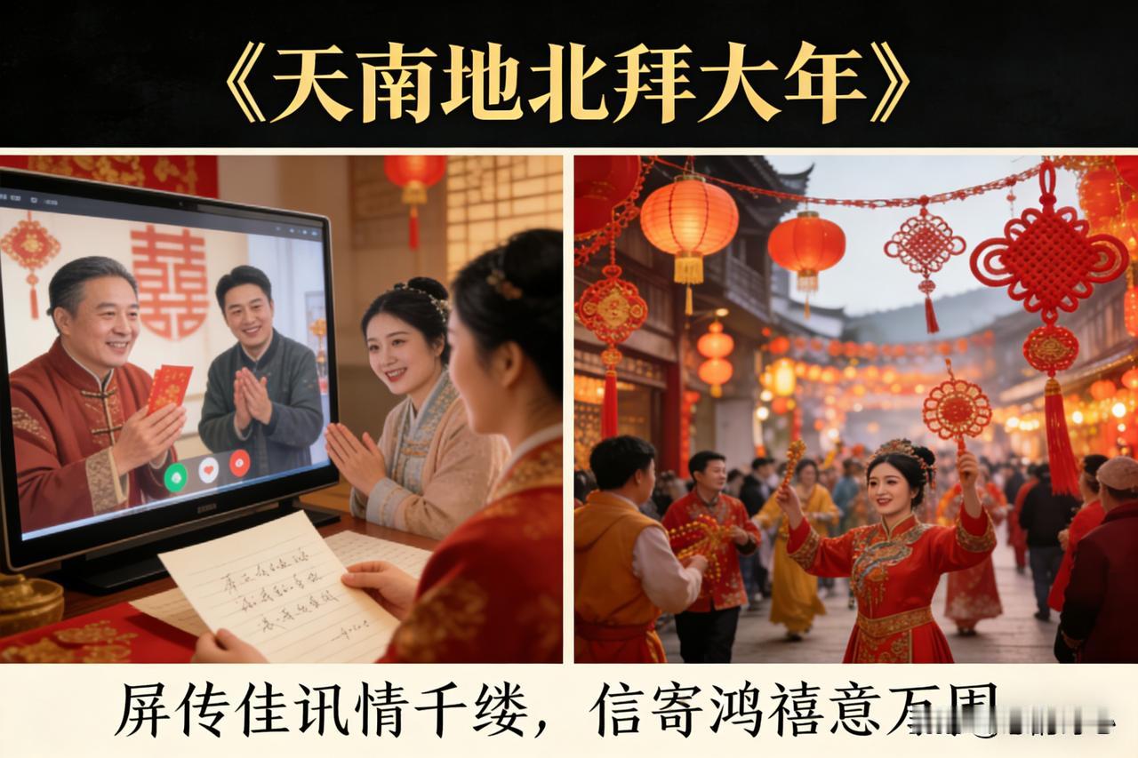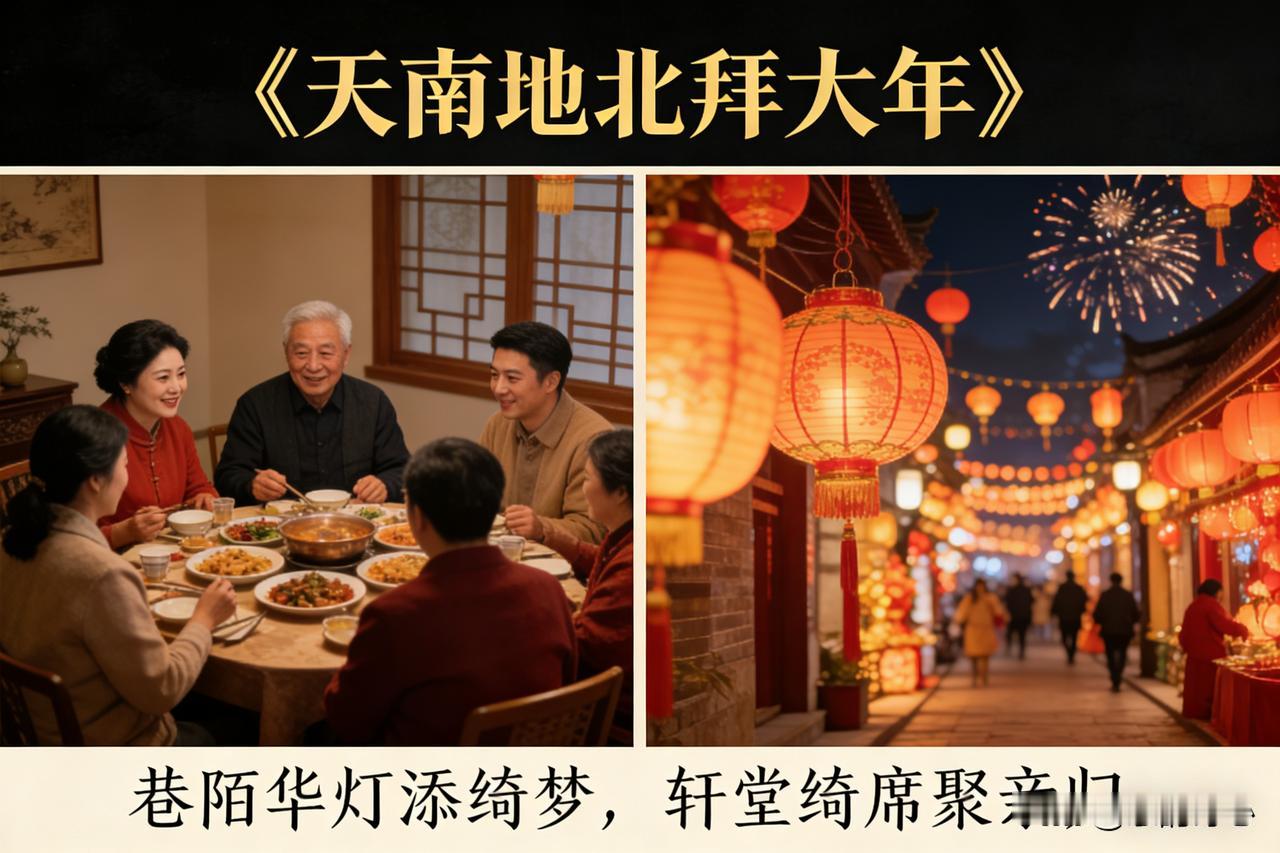 天南佳气漫祥霏, 地北欢歌绕瑞徽。 巷陌华灯添绮梦, 轩堂绮席聚亲归。 屏传佳讯情千缕, 信寄鸿禧意万围。 四海同斟新岁酒, 共期家国永腾辉。 这首诗词以天南地北的佳节盛景开篇,既描绘了传统年俗里张灯设宴、亲友团圆的温馨画面,也融入了视频传讯、微信送福的新世代拜年方式。最后以四海同饮新酒、共祝家国腾飞作结,兼顾了传统年味与时代新意,传递出对新年团圆美满、家国昌盛的美好祈愿。