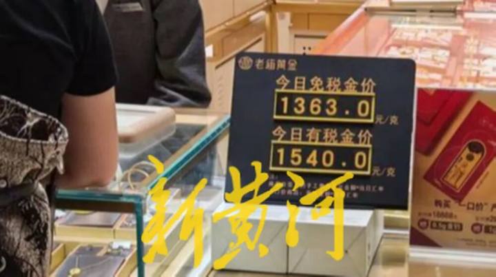 如果说服装区是热闹,那黄金饰品区则更为火爆。老庙黄金门口醒目的价格牌上显示:“今日免税金价1363元/克,有税金价1540元/克,算下来每克价差高达177元。”