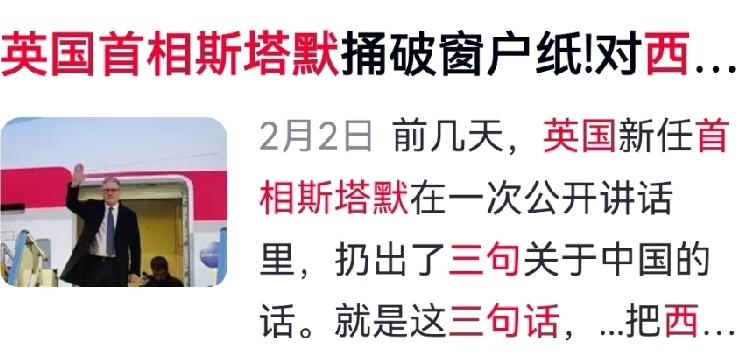 斯塔默三句话,道破西方对华真相? 英国首相斯塔默访华,三句话直白清醒,戳破西方长期自欺欺人的鸵鸟心态。 他坦言:中国不是“正在崛起”,而是已经崛起。作为西方大国首相,这句客观评价难得可贵。中国已是全球第二大经济体、第一大货物贸易国,新能源、高铁、高端制造等实力稳居世界前列,发展成就不容否认。 他直言:对中国装鸵鸟,极不明智。英国八年未实现首相访华,一味追随对华强硬,将意识形态置于国家利益之上,最终只会自损发展。如今多国积极对华合作,英国再固执封闭,只会被时代抛下。 人未下飞机便表态:我是来给英国带回红包的。此次携大批工商界人士访华,直奔经贸合作、投资订单,本质是为英国经济纾困解难。 清醒务实,源于现实压力。斯塔默此举,核心是国家利益优先。 正视中国、选择合作,才是理性正道。愿中英抛开偏见、务实共赢,也期待更多西方国家看清大势,停止内耗对抗,拥抱互利合作。 对此你怎么看?