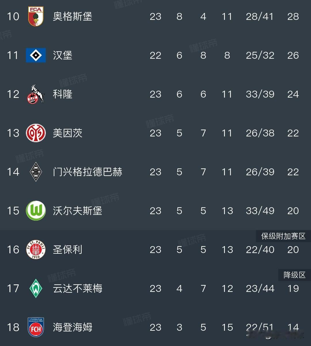 德甲积分榜丨汉堡的位置非常稳固,6胜8平8负积26分排名第十一,汉堡领先保级区6个积分和5支球队,汉堡保级是无忧的,再发点力排名就进入中游了,长期待在德乙还是积累了一些底蕴,连续多个赛季在德乙当强队,来到德甲也基本能站稳。