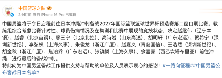 赵继伟(辽宁本钢)、赵睿(北京首钢)、廖三宁(北京北控)、高诗岩(山东高速)、胡明轩(广东宏远)、贺希宁(深圳新世纪)、李弘权(上海久事)、朱俊龙(浙江广厦)、赵嘉义(青岛国信)、王浩然(深圳新世纪)、胡金秋(浙江广厦)、焦泊乔(广东宏远)、张镇麟(上海久事)、余嘉豪(西乙坎塔布里亚)前往冲绳,进行最后的备战冲刺。