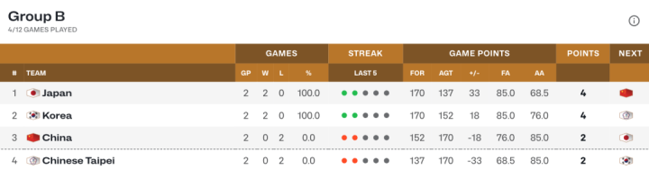 目前中国男篮2负韩国排名小组第三。