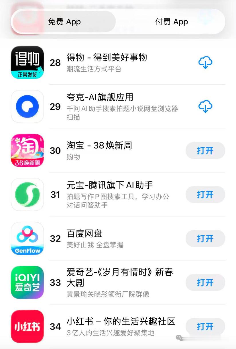 腾讯元宝已经跌出苹果App Store免费APP下载榜单前30了