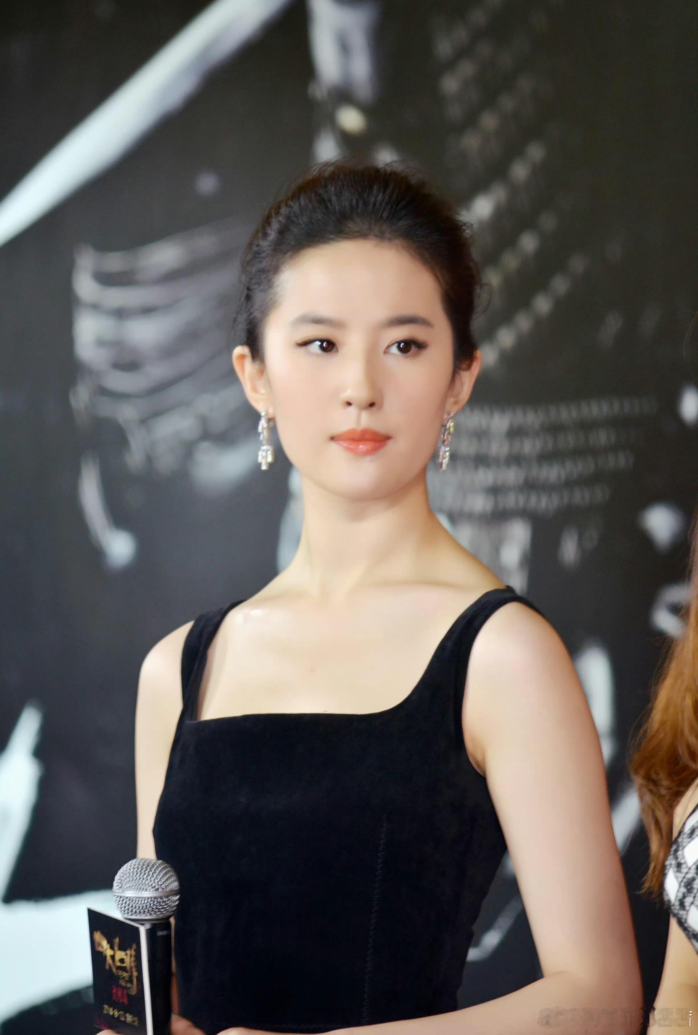 刘亦菲身着黑色丝绒方领吊带裙,丝绒的哑光质感在灯光下细腻变化,既沉稳又华丽。方领设计巧妙露出精致锁骨,宽肩带平衡露肤度,完美勾勒出她纤细却充满力量的身形。
