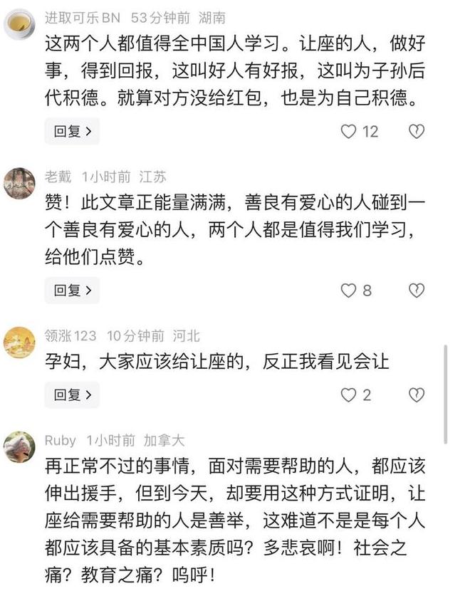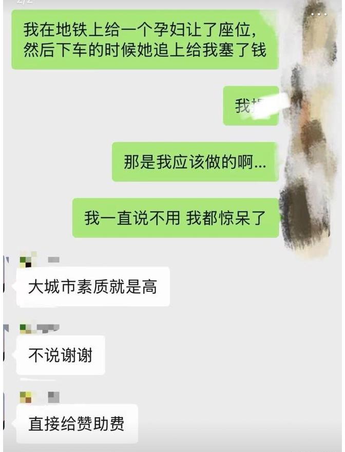这下全国人民都知道了! 广东深圳,在人潮汹涌的地铁5号线上,竟然发生了如此暖心的一幕。姑娘小洛只是做了一件让座的小事,却在下车时收获了一份沉甸甸的惊喜,这件事在网上一曝光,瞬间暖哭了上万网友! 根据小洛发布的帖子,正是晚上7点的下班高峰期,布吉站的站台上挤满了疲惫的打工人。小洛刚上车坐下,就瞅见旁边站着一位身穿灰裙子的准妈妈。 让人揪心的是,这位孕妇竟然自带了一个明黄色的塑料小矮凳,就那样局促地缩在车厢一角。明明车厢里设有孕妇专座,可放眼望去,却没有人起身。 小洛心里一阵难受,赶紧站起身让准妈妈过来坐。孕妇起初还不好意思,指着自己的小凳子说“我有位子”。可那凳子实在太矮了,挺着大肚子的孕妇坐下去,腿都伸不开,看着就让人心酸。在小洛的坚持下,准妈妈才坐了过去。 可谁也没想到,就在小洛准备下车时,那位准妈妈突然掏出一个百元大红包硬塞进她手里,说是过年图个吉利。等小洛反应过来时,车门已经缓缓关闭,只剩下她愣在站台上,看着地铁呼啸而去,手里攥着那份滚烫的谢意。 网友看后纷纷感慨道: “这两个人都值得我们学习,一个心肠好,一个懂感恩,这才是好人有好报!” 也有网友说:“这一百块钱,买到的是人与人之间最珍贵的体谅。” 老话说,“爱出者爱返,福往者福来”。 其实,这100元红包哪里仅仅是钱啊?它更是一个准妈妈对社会善意的最高礼赞。在这个快节奏的城市里,打工人不容易,我也理解,可一个孕妇得有多“死心”,才会专门带个小板凳坐地铁?得亏是碰上了小洛这样实在的姑娘。 你说这100块钱红包,我觉得收得值!它不光是给小洛的奶茶钱,更是给那些“霸占孕妇专座的人”一个响亮的耳光! 对此您怎么看呢?
