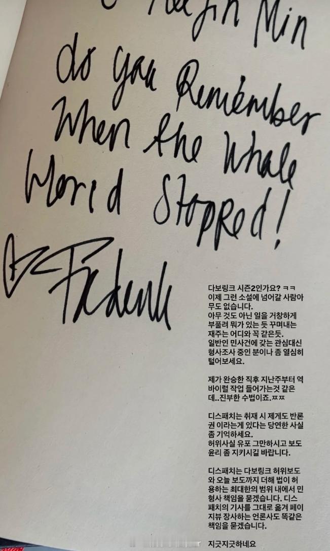 闵熙珍回应被曝带newjeans见日本贵族爷爷闵熙珍嘲讽D社在写小说 23日,D社曝闵熙珍曾带newjeans成员多次在日本与一位贵族爷爷见面,知情人士称闵熙珍是为了寻求投资才这样安排。对此,闵熙珍回应:“现在没人会相信这种小说了”。