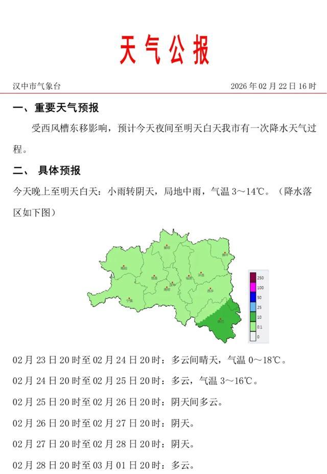 预计02月22日20时至23日20时,延安南部局地有小雪(0.1~2.5毫米),关中西北部高海拔山区、秦岭山区、商洛北部部分地方有中到大雪(2.5~10毫米),秦岭山区部分地方(西安市长安区、鄠邑区、蓝田县、周至县,宝鸡市太白县,渭南市华州区、潼关县)和商洛北部局地(商州区、洛南县、柞水县)有暴雪(10~18毫米),商洛南部有雨夹雪或小到中雨(0.1~15毫米),关中南部有小雨(0.1~5毫米),陕南河谷地带有小到中雨(0.1~15毫米),汉中南部局地(镇巴县)有大雨(25~30毫米),巴山局地有雨夹雪(0.1~15毫米)。秦巴山区部分地方(宝鸡市太白县、凤县,安康市宁陕县、紫阳县、岚皋县、镇坪县)有冻雨或冰粒。