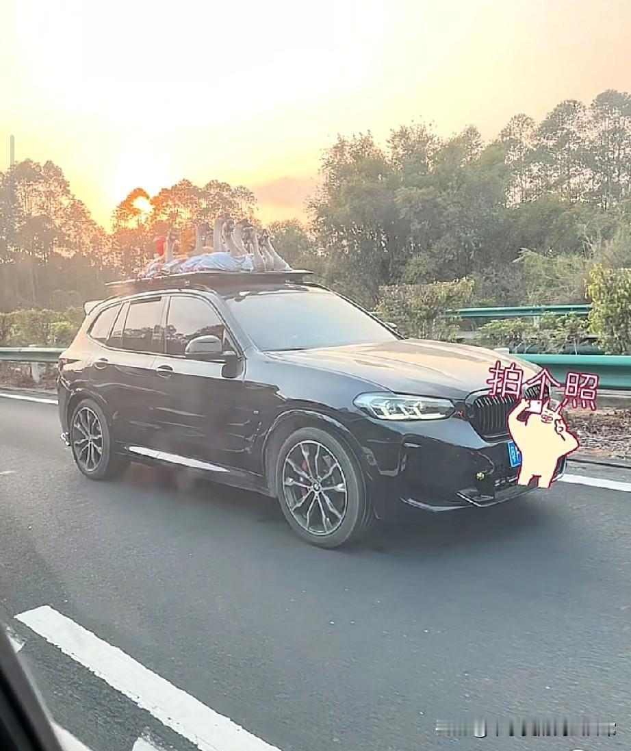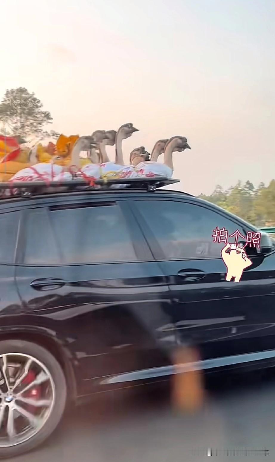 史上最强宝马X5装鹅封神! 返程高速最“豪横”车主,这是移动养殖场 2026返程名场面再升级!黑色宝马X5车顶堆满行李,十几只大鹅探着脖子挤成一排,在夕阳下的高速上“兜风”,瞬间刷爆车友圈。 这一幕被路人拍下,网友评论区直接炸锅。有人调侃“鹅生巅峰,坐宝马看车展”,广西网友秒懂:“这是从老家拉回广东的硬货,5年老鹅头在广东能卖大几百”。 从车尾挂鸡鸭到车顶载大鹅,返程的后备箱永远装不下父母的爱。这哪里是带特产,分明是把老家的牵挂全搬上了车。你返程时,爸妈往你车上塞过最离谱的东西是什么?