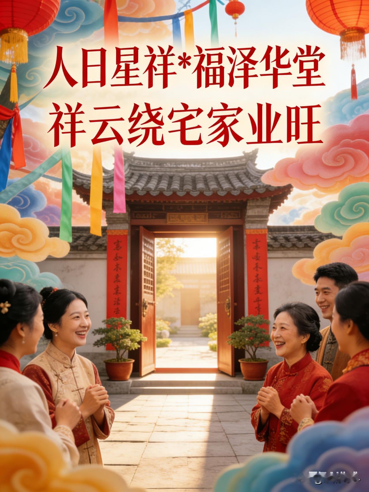 《人日星祥·福泽华堂》乐韵诗心原创诗词: 初七人日喜气洋, 七星高照好运长。 祥云绕宅家业旺, 瑞气盈门福满堂。 这首诗词的核心意象在于“人日”这一传统节令与家宅兴旺的紧密联结。首句点出正月初七“人日”节庆,奠定了全诗喜庆、祥和的基调。次句借“七星高照”这一星象隐喻,预示着长久不衰的鸿运与福泽。后两句则由天象转入家宅细节,描绘出祥云环绕、瑞气升腾的宏大视觉感,象征着家族事业如日中天,家庭生活圆满安康。全诗辞藻华丽且充满力量感,通过对自然祥瑞与人文关怀的交织描写,表达了对家业长青、福寿绵延的极致期许。