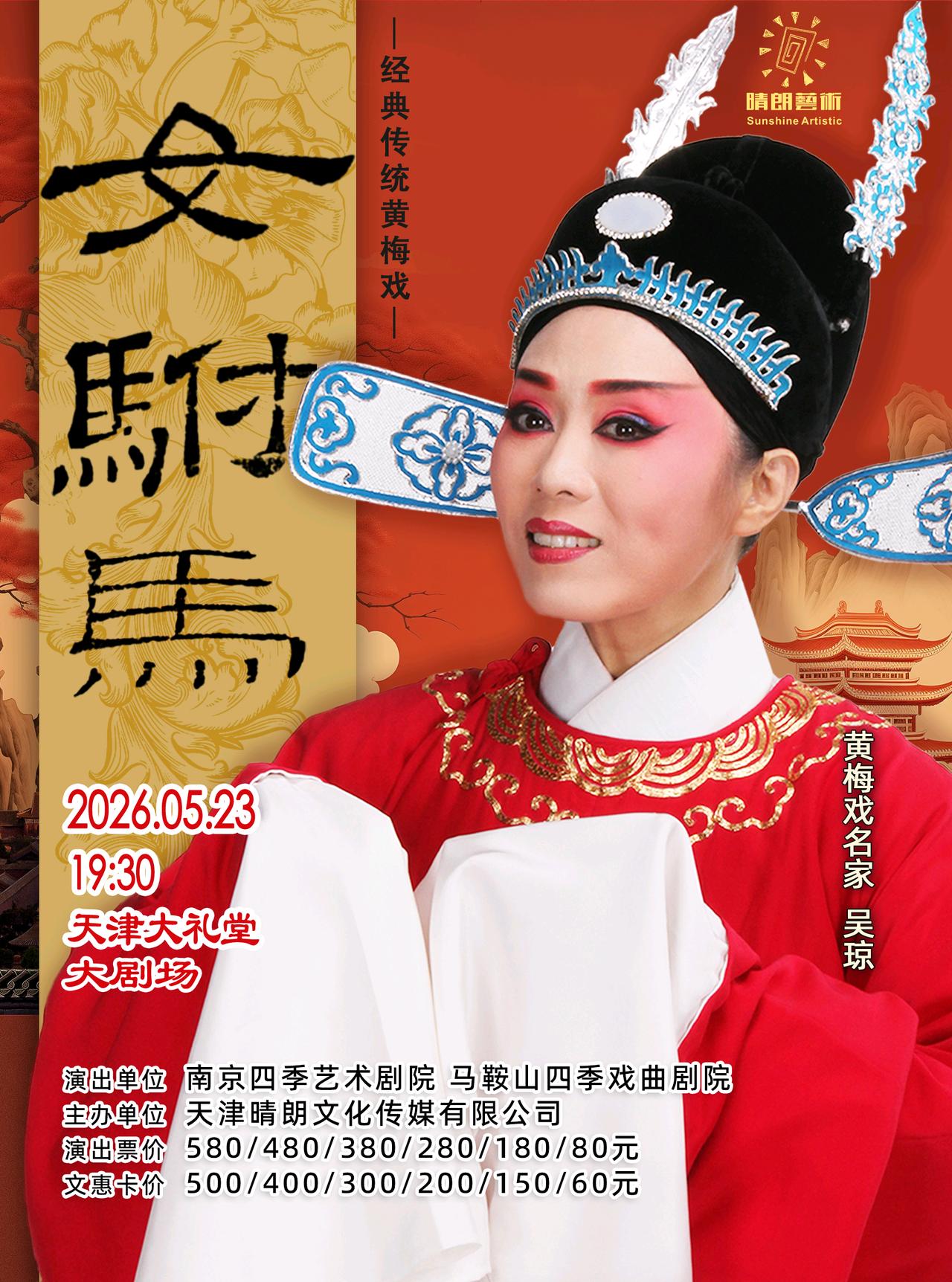 由吴琼主演的经典黄梅戏《女驸马》《天仙配》,将分别于5月23日晚、24日晚在天津大礼堂上演。 黄梅戏《女驸马》 吴琼 饰演 冯素珍 孙雪莲 饰演 玉真公主 黄梅戏《天仙配》 吴琼 饰演 七仙女 瞿凌云 饰演 董永