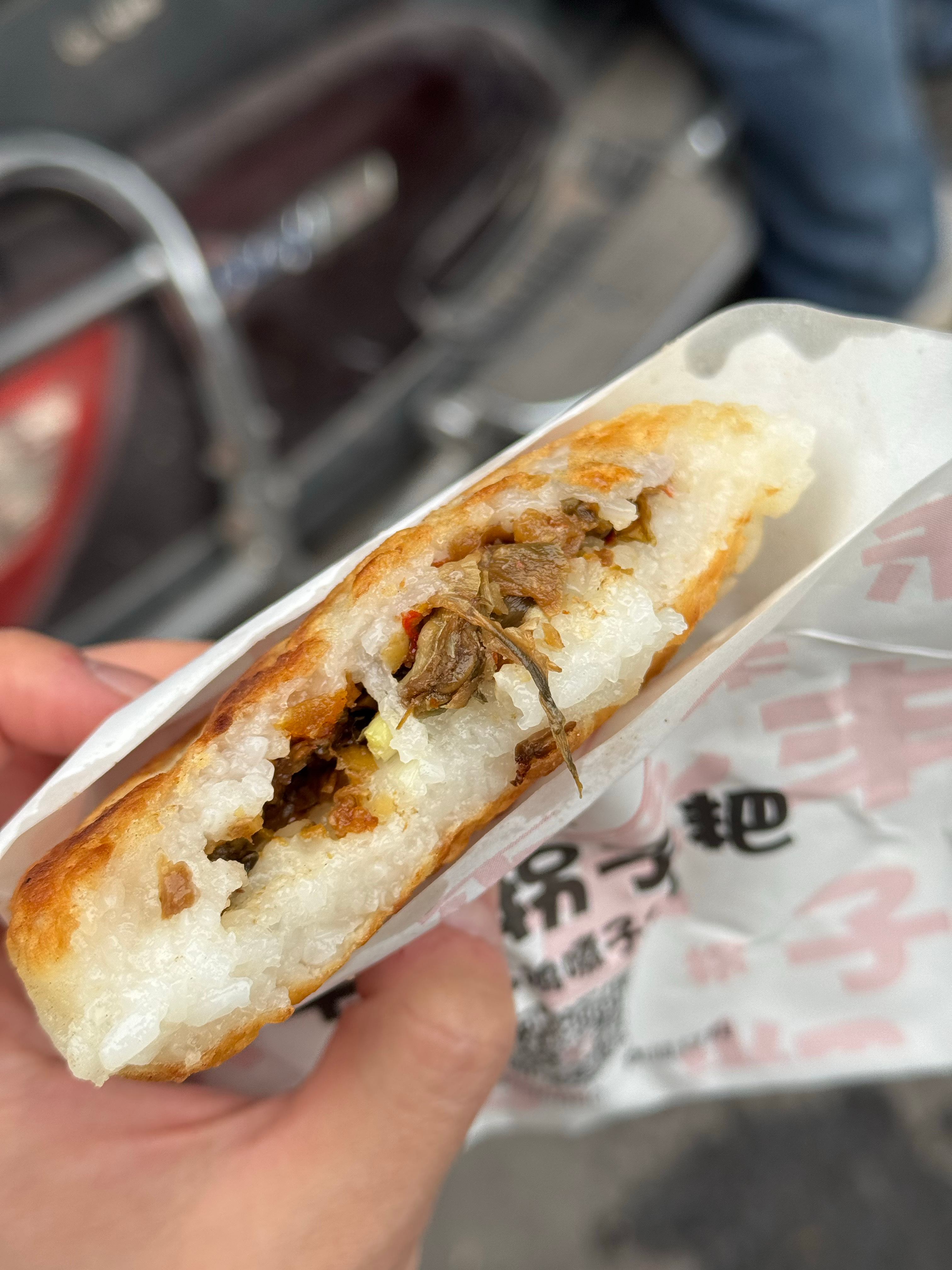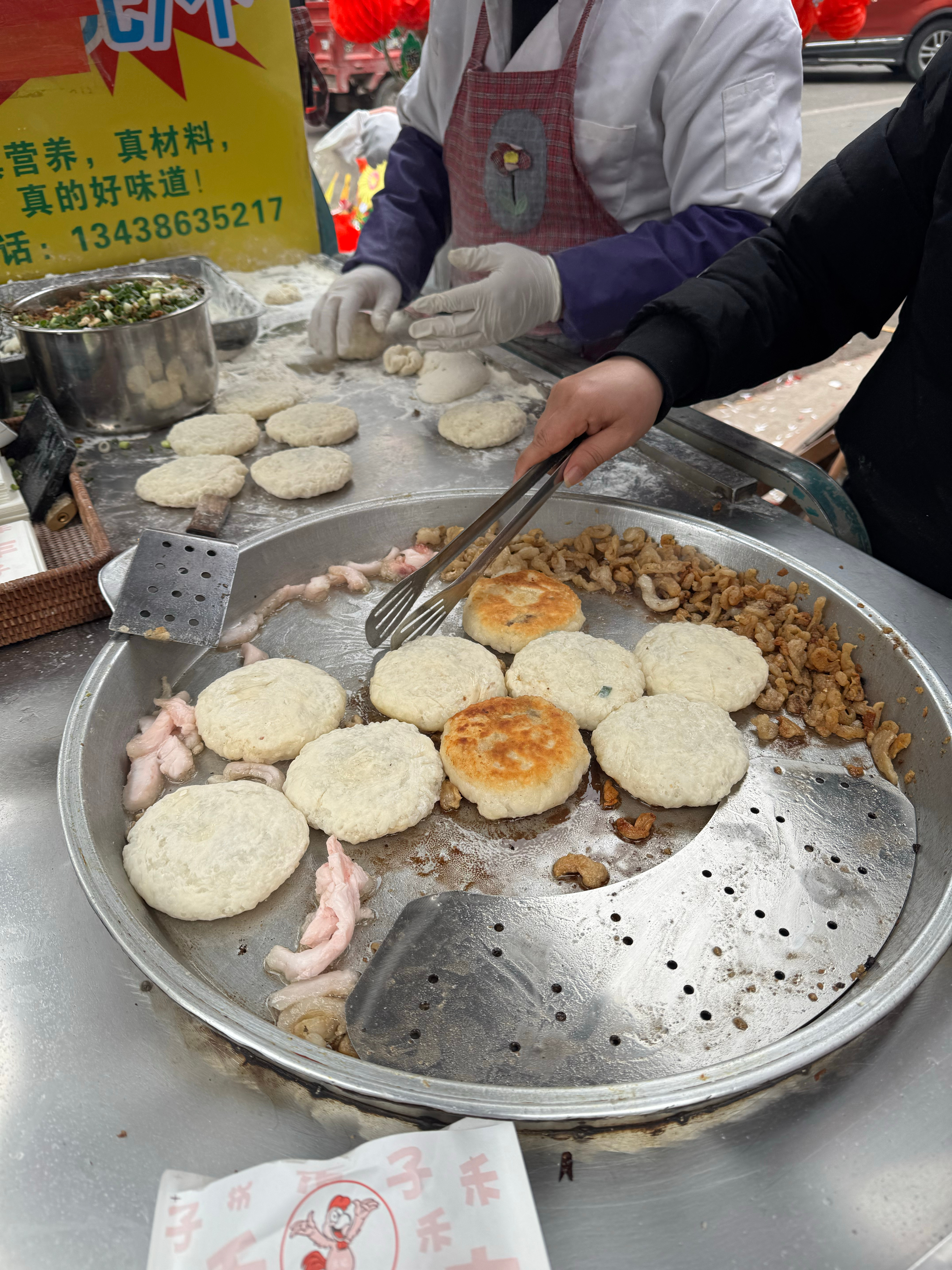 以前只是一个街边小炉子,1.5元一个,薄薄的糯米里面夹一点咸菜,简约但是很不一样,现在已经成大摊了,还有了专属名字拐子耙,加厚加大4元一个,但是却不是小时候的味道了川川逛吃日常