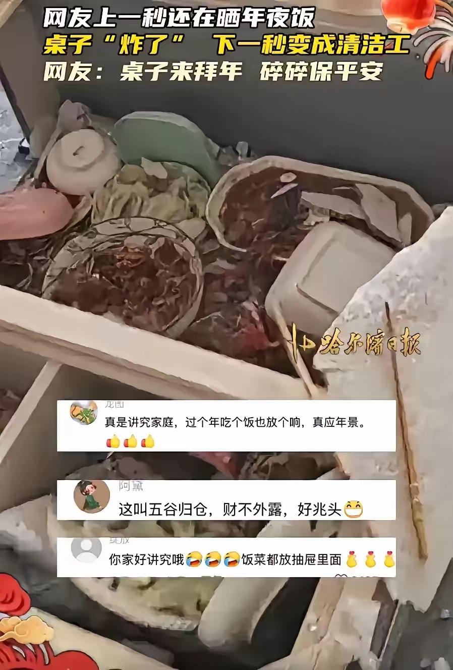 万万没想到!黑龙江,女子家里做了一桌的年夜饭,放到茶几上一口都没舍得吃,就想着先拍个照发朋友圈,不料,前一秒还好好的,下一秒餐桌就“炸了”,一桌子的菜全都白瞎了,网友:一大家白忙活一下午。 东北家庭筹备年夜饭,从来都舍得花时间下功夫。这家人从午后就开始忙碌,洗菜、切配、炖煮、煎炸,每一道工序都不马虎。小鸡炖蘑菇、酸菜炖白肉、锅包肉、炸丸子,十几道硬菜全用瓷盘、汤盆盛装,菜码大、分量足,是地道的东北过年排场。女子看着满桌热气腾腾的饭菜,想先拍一张整齐的照片留存,再分享给亲友,这份想留住年味的心思,普通人都能感同身受。 她把所有菜品集中摆放在茶几上,反复调整位置,就为拍出满意的画面。家用轻便茶几日常摆放零食、茶具没有问题,面对密集摆放的 heavy 餐具与热菜,承重压力会成倍增加。家人都沉浸在过年的喜悦里,没人意识到风险正在靠近。前一秒还在核对拍摄角度,下一秒茶几支架突然断裂,桌面瞬间倾斜,菜肴、汤汁全部撒落,精心做好的年夜饭彻底无法食用。 现场的人全都愣住,没人愿意相信几秒之间,一下午的辛劳全部落空。没有指责,没有抱怨,只有实打实的惋惜。网友的留言满是共情,大家都懂准备年夜饭的不易,从采购食材到出锅摆盘,耗费的不只是时间,更是一家人对新年的期盼。饭菜被糟蹋事小,这份落空的期待,才最让人心里难受。 过年拍照记录团圆场景,已经成为多数家庭的习惯。大家想把丰盛的饭菜、团聚的画面保存下来,传递节日的快乐。追求仪式感没有错,忽视居家安全就会埋下隐患。普通轻型茶几的静态承重有明确限值,东北年夜饭菜品多、器皿重,集中堆放会大幅超出家具的承受能力。 国家家具质量标准明确规定,茶几需满足对应的力学性能与承重要求,劣质或结构老化的茶几,在重物压力下极易出现坍塌。这类意外并非个例,春节期间,多地发生过因家具承重不足导致的物品损毁事件,只是多数没有造成严重后果,没有被广泛关注。 女子的初衷只是简单记录生活,却因为一个细节疏忽,毁掉了全家的年夜饭。好在意外没有造成人员受伤,这是最值得庆幸的地方。饭菜可以重新制作,家人的平安健康,才是过年最珍贵的事。 过年的核心是团圆,不是追求形式上的完美。不必为了拍照刻意堆砌物品,不必为了视觉效果忽视安全隐患。摆放年夜饭时,优先使用稳固的实木餐桌,分散重物压力,提前检查家具结构,这些小举动都能有效规避风险。 仪式感要建立在安全的基础上,年味的本质是家人相伴,不是一张精致的照片。一次小小的意外,给所有家庭提了醒,节日期间多一份细心,就能少一份遗憾,平平安安,才是最踏实的新年。 各位读者你们怎么看?欢迎在评论区讨论。