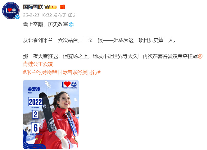 国际雪联致敬谷爱凌 :“从北京到米兰,六次站台,三金三银——她成为这一项目历史