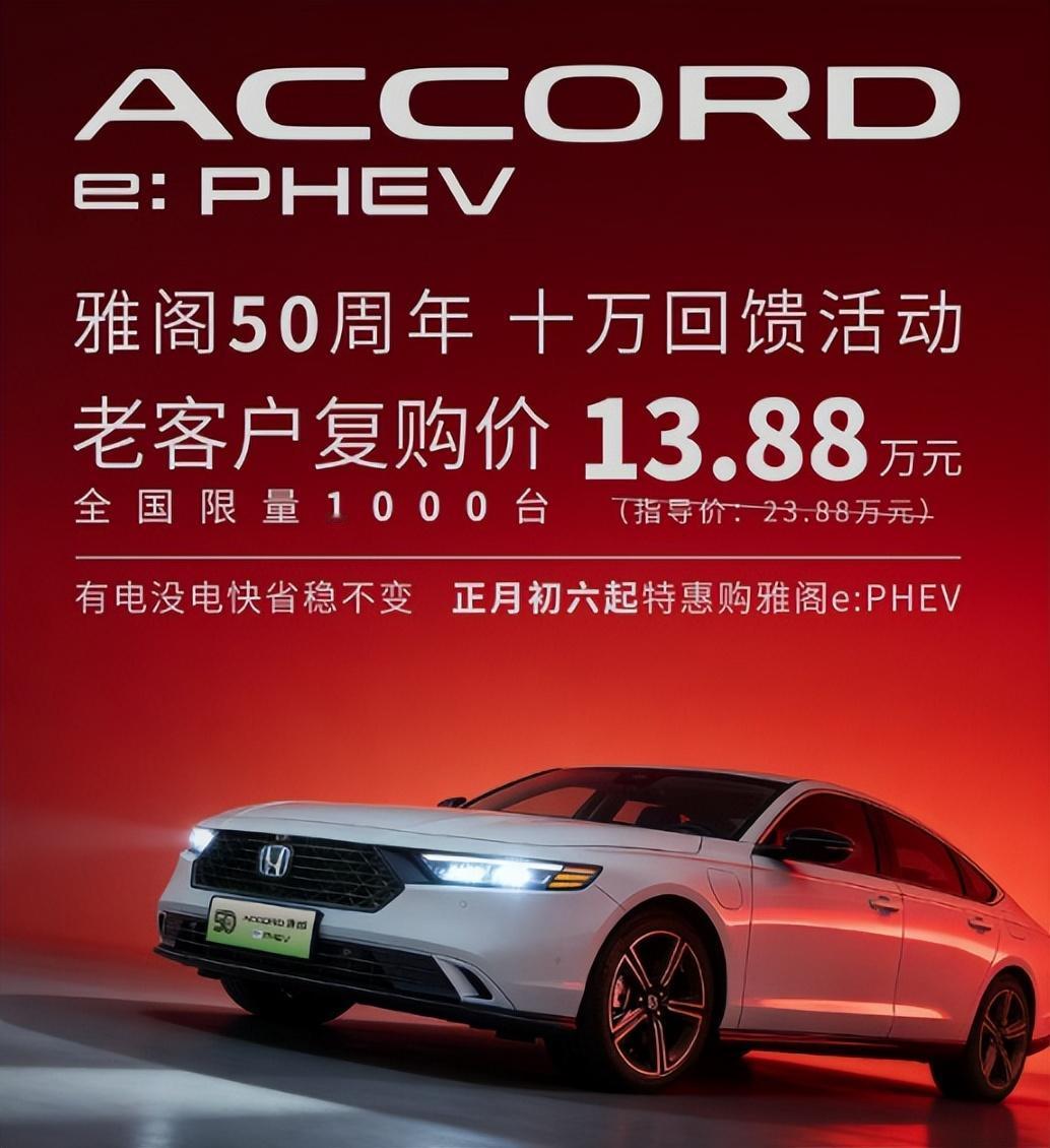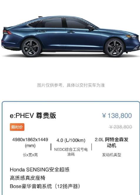 本田过年想明白了!中型混动优惠10万,配L2智驾+综合油耗1.29L! 说到本田雅阁,可能很多小伙伴都非常熟悉,本田雅阁在终端的优惠幅度一直比较大。但是大家仔细看一下会发现,指导价其实并不算离谱,所以说在终端即使优惠幅度大,也只不过4-5万元左右,但是你见过优惠10万左右的本田雅阁吗?对于本田来说这已经是很大的幅度了!今天介绍的是本田雅阁新能源,目前厂家开启了一口价优惠幅度,23.88万元,直接优惠10万元,只需要13.88万元就能够买到。 事实上不管是优惠还是最终的裸车价,都表现得可圈可点。为什么这款雅阁PHEV的优惠幅度如此之大呢?简单来说就是很多朋友并不太清楚这款新车的存在,销量自然较为一般。 从动力系统来看,雅阁PHEV采用了2.0L加电机组成的插电式混动,纯电续航里程106km。这套动力系统就是本田第4代的i-mmd混动系统,新车可以纯电行驶,也能通过油电混动的形式加以驱动,综合百公里油耗仅仅只有1.29升。 此外,这款新车和很多插电混动或者增程式的新车一样,是支持电池预加热功能的,而且也搭载了慢充功能。值得一提的是,这款雅阁PHEV是不支持快充的,采用的也是比较便宜的宁德时代的钠离子电池。钠离子电池最大的优势在于低温效果较好,但是充电速度慢,而且电池密度偏低。也正是由于这样的原因,这款雅阁PHEV搭载了17.7度电,不过纯电续航里程理论上只有100km出头。 从整个外观造型来看,设计与我们熟知的燃油版本田雅阁是如出一辙的,采用了比较扁平化的造型。唯独有些不同的就是这是一款新能源汽车,搭载的自然也是绿牌的设计,这也是两者外观最大的差异性了。 内饰设计与燃油版的本田雅阁同样如出一辙!配置层面还不错,新车搭载了12.3英寸的悬浮式智能屏幕,也拥有11.5英寸的HUD数字抬头显示功能。除此之外,还搭载了Bose音响,L2级别的智能驾驶辅助系统,但缺席了360度全景影像系统。事实上,这款雅阁PHEV属于中配车型,叫做尊贵版本,目前售价方面非常划算,但是很明显这是一款通过油改电形式发布的新能源汽车,在终端的销量确实一般。 总结:如果有家充条件,这款雅阁PHEV并没有缺点。 如果没有家充条件,但能接受一两个月去慢充一次电,其实也没毛病!如果接受不了慢充,还是建议等一等。【来自懂车帝车友圈】