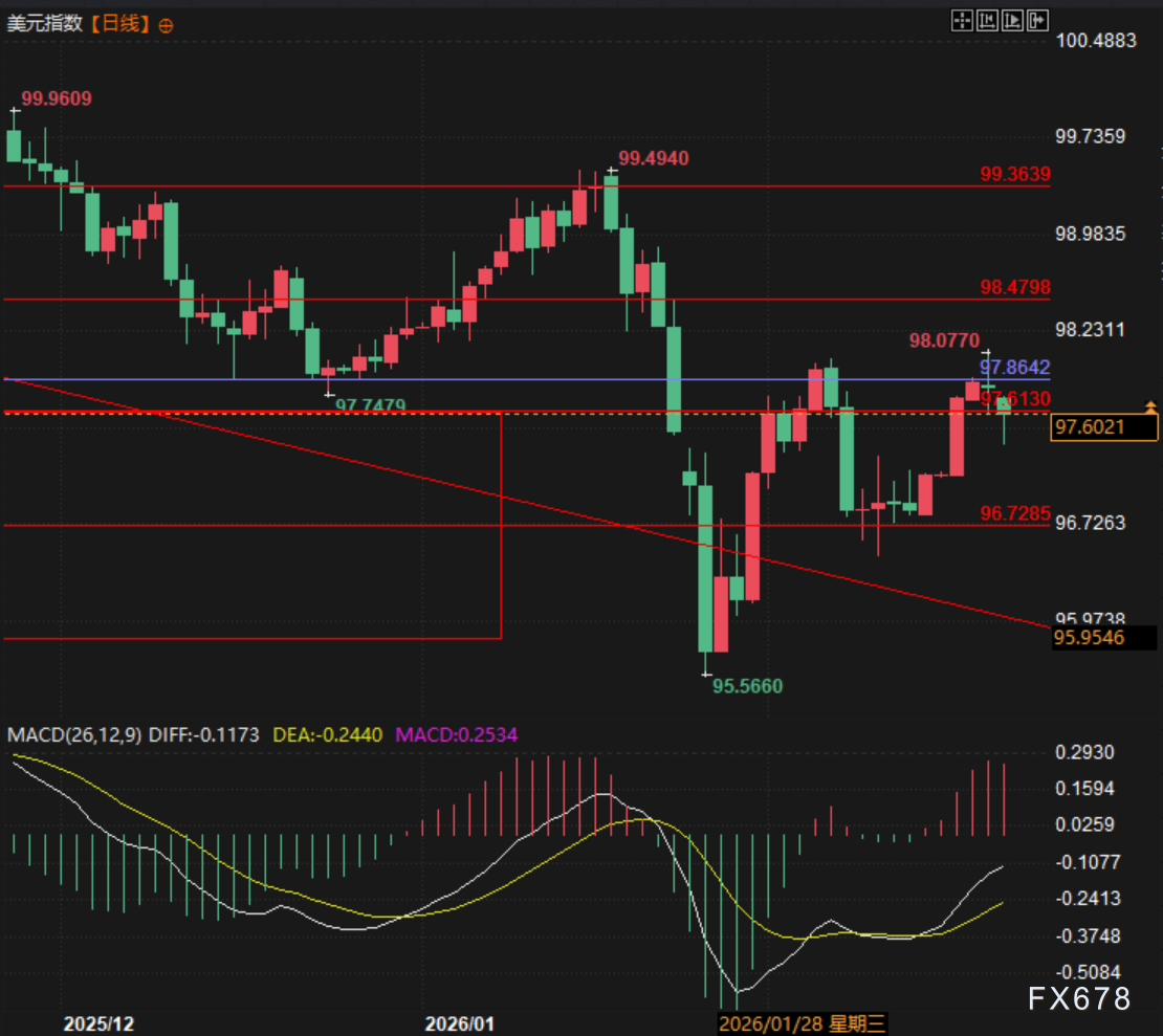汇通财经APP讯——周一(2月23日)亚欧时段,美元指数延续上周五回调走势,走出探底小幅回升走势,目前交投于97.52,跌幅-2.8%。