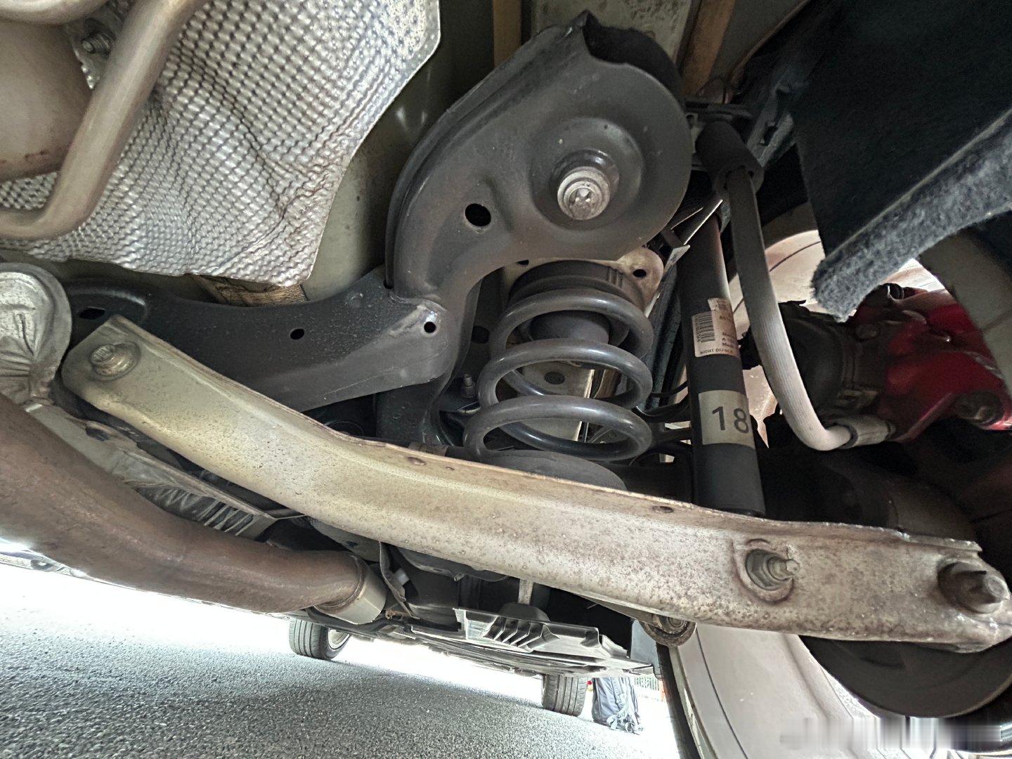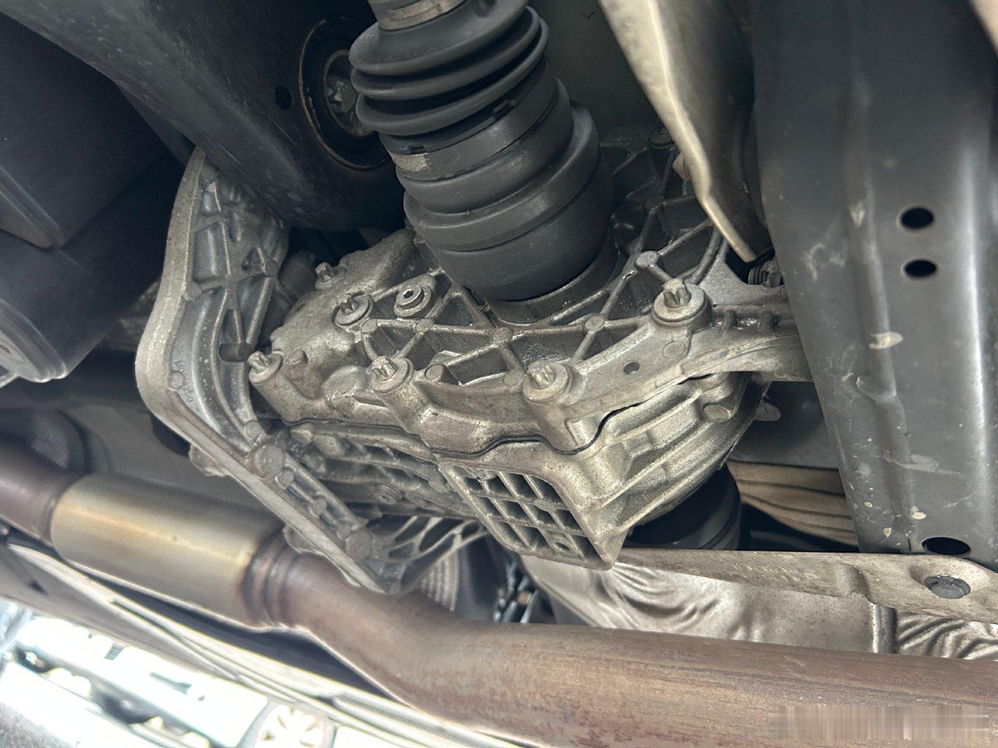 车行没有举升机,所以直接躺地上钻到车底下去看。因为 GLA45 是四驱车,所以要留意传动轴、差速器的状态。另外奔驰车普遍由于后备箱内饰地毯不好拆卸的原因,所以查看后部事故只能从底下去看了。