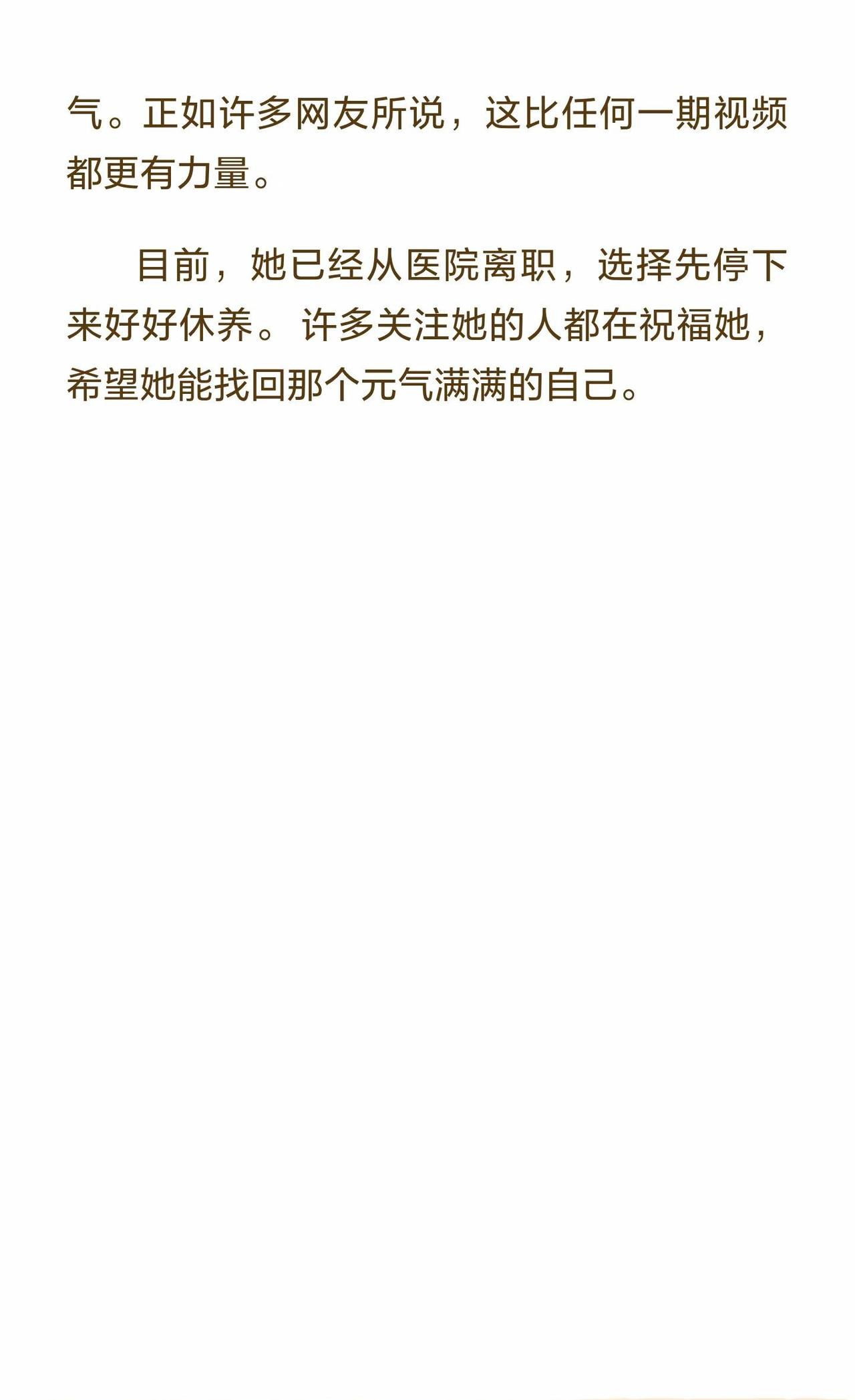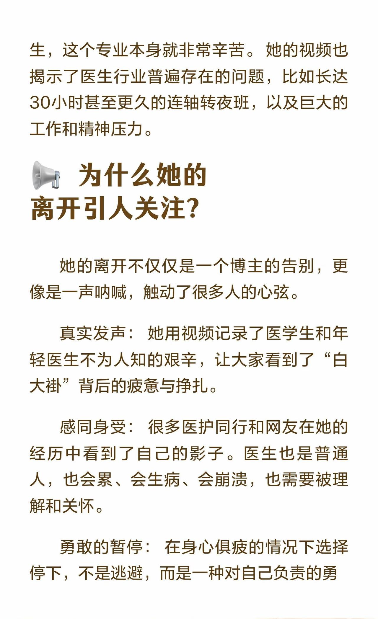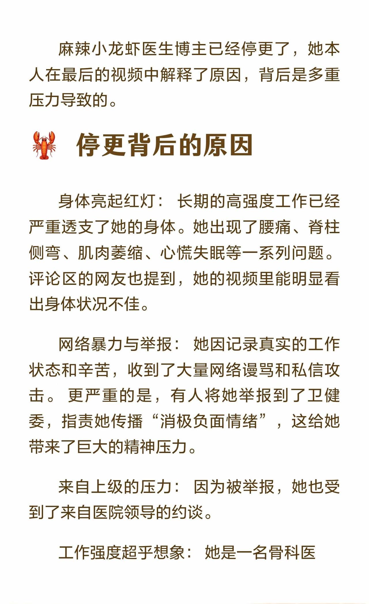 麻辣小龙虾医生博主已经停更有感 麻辣小龙虾医生博主因身体和精神压力停更,长期高强度工作导致健康问题,同时遭受网络暴力和举报,被迫停职。她的离开引发共鸣,揭示了医学生和年轻医生的艰辛与疲惫,呼吁社会给予更多理解与关怀。爱你老己 远离消极情绪 医护人员 身体健康才能好好活着 用记录抵抗麻木